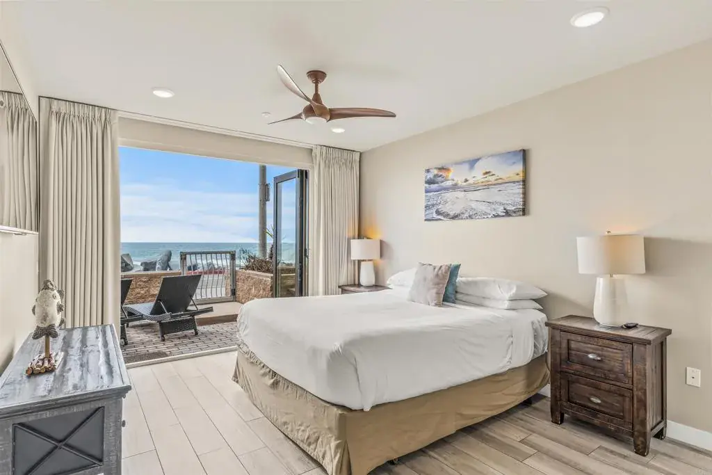 Experience true oceanfront living at one of Oceanside’s most coveted addresses—700 South The Strand. This stunning contemporary residence offers panoramic white-water ocean views creating a front-row seat to the Pacific and unforgettable sunsets. Designed with an open-concept, single-level floor plan with no stairs, the home offers easy, seamless access throughout. Indoor-outdoor living is elevated through expansive folding glass doors that open to a spacious private patio—perfect for relaxing, entertaining, or enjoying the beach lifestyle just steps away. The primary bedroom enjoys tranquil ocean views and direct access to the patio, offering a serene coastal retreat. The open kitchen is ideal for entertaining, featuring generous counter seating and a layout that flows effortlessly into the living and dining spaces. The residence includes two spacious bedrooms, two and a half bathrooms, private in-unit laundry, a large owner’s storage room, plus an additional private storage space conveniently accessed from the garage. Offered fully furnished and completely turnkey, this home is ready to enjoy immediately—just bring your suitcase. The HOA allows short-term rentals with a 7-day minimum, making it an exceptional opportunity for both personal enjoyment and investment potential. Additional highlights include stair-free access, two assigned parking spaces in a gated, secure garage, and a striking contemporary building design that stands out along The Strand. Located moments from the pier, harbor, shops, dining, and all that downtown Oceanside has to offer, this is coastal luxury living at its finest. Don’t miss your chance to own a slice of paradise!