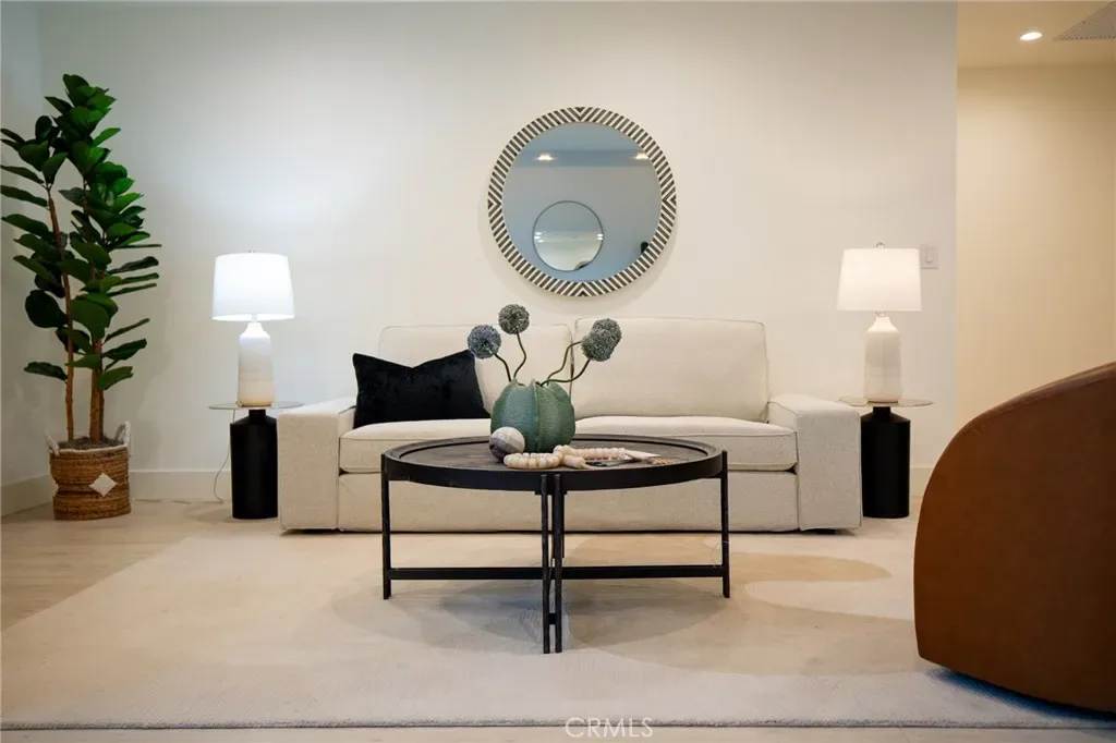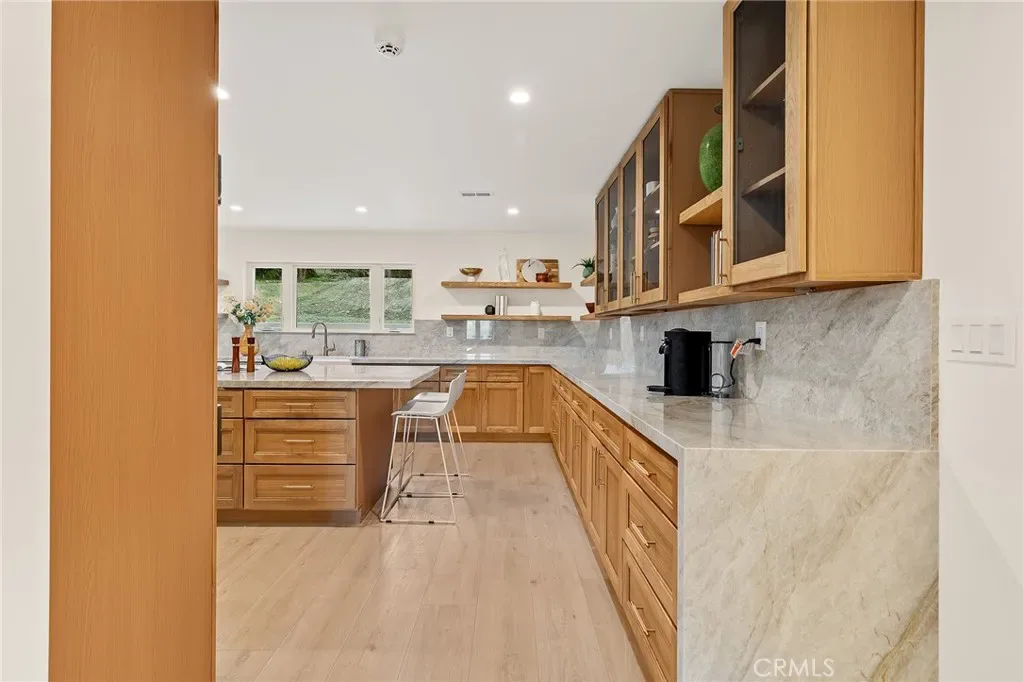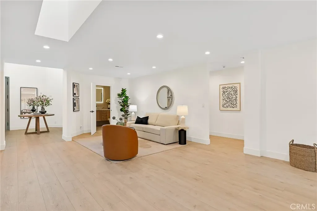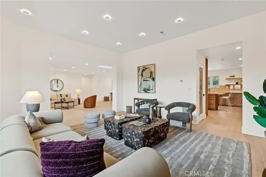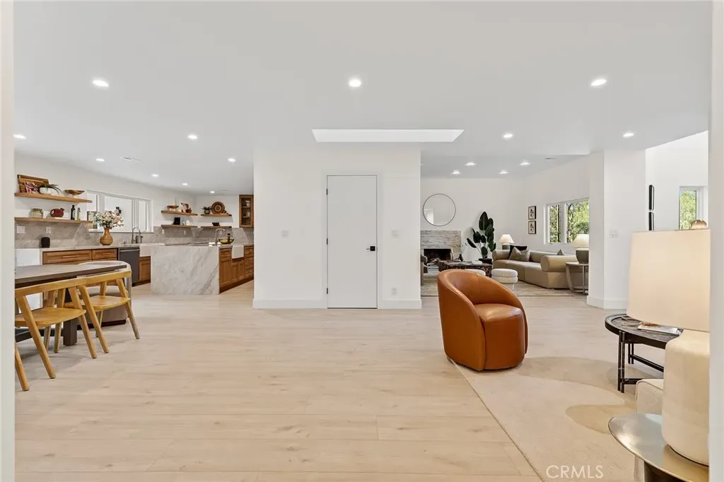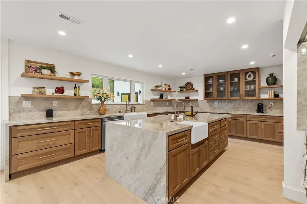 Inside, you’re welcomed by sustainable European flooring, custom Andersen windows, and a light-filled open layout. The chef’s kitchen is a true centerpiece, featuring Taj Mahal quartzite waterfall island, custom cabinetry, floating shelves, a 60” Wolf dual-fuel range, Sub-Zero Pro 48” refrigerator, dual Fireclay farmhouse sinks, and Brizo Litze Gold fixtures. Designed for both entertaining and daily living, this space is as functional as it is stunning.