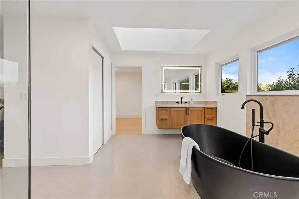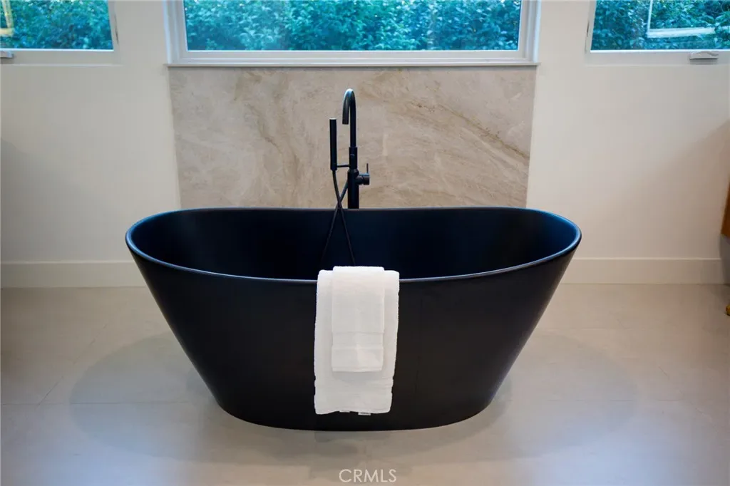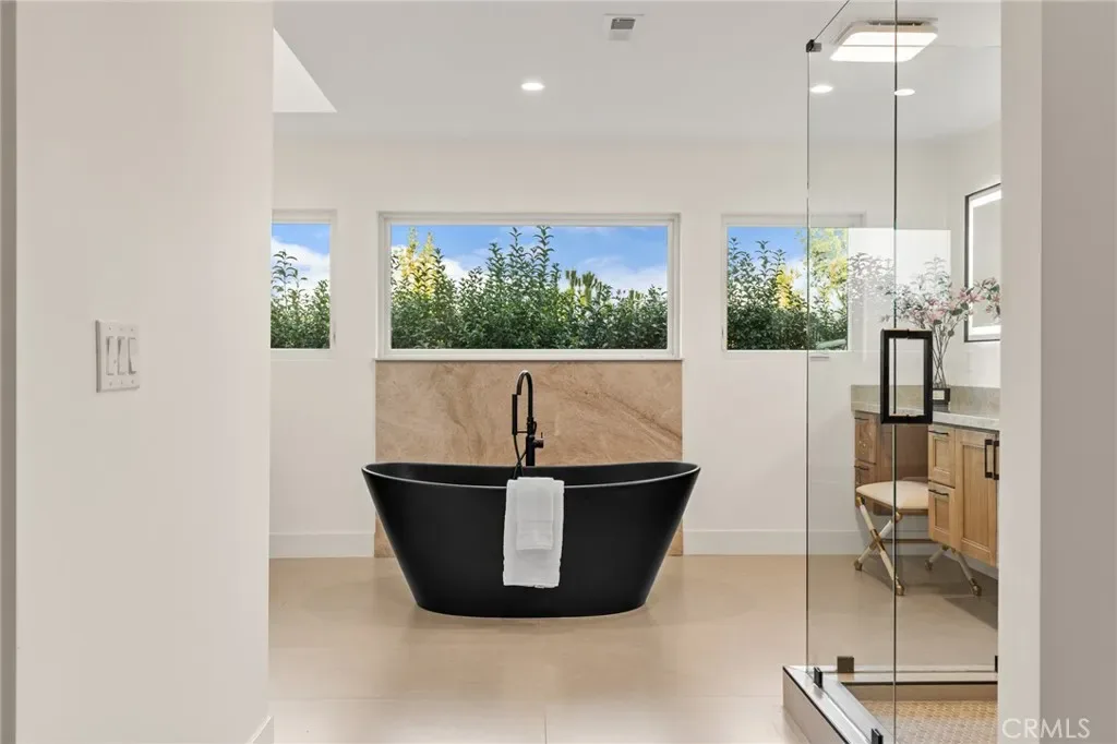 The primary suite offers a spa-inspired retreat with a freestanding soaking tub, oversized rain shower with natural stone surround, and premium Kohler smart toilets. A Navien tankless water heater ensures long, relaxing evenings of comfort.