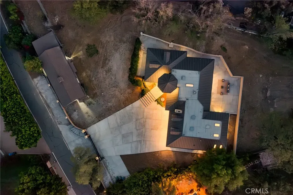 A dramatic 22-foot custom gate opens to an expansive driveway designed to accommodate guests with ease. The striking exterior showcases a turret-style entry, Standing Seam metal roof with copper gutters, smooth three-coat stucco, and sleek aluminum-and-glass garage doors—delivering both elegance and durability.