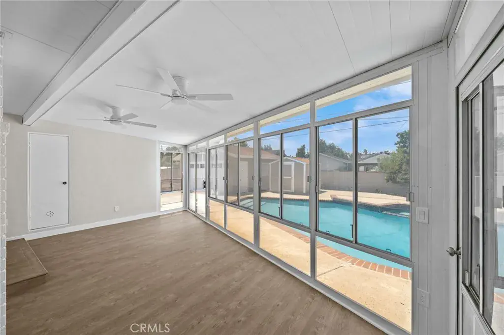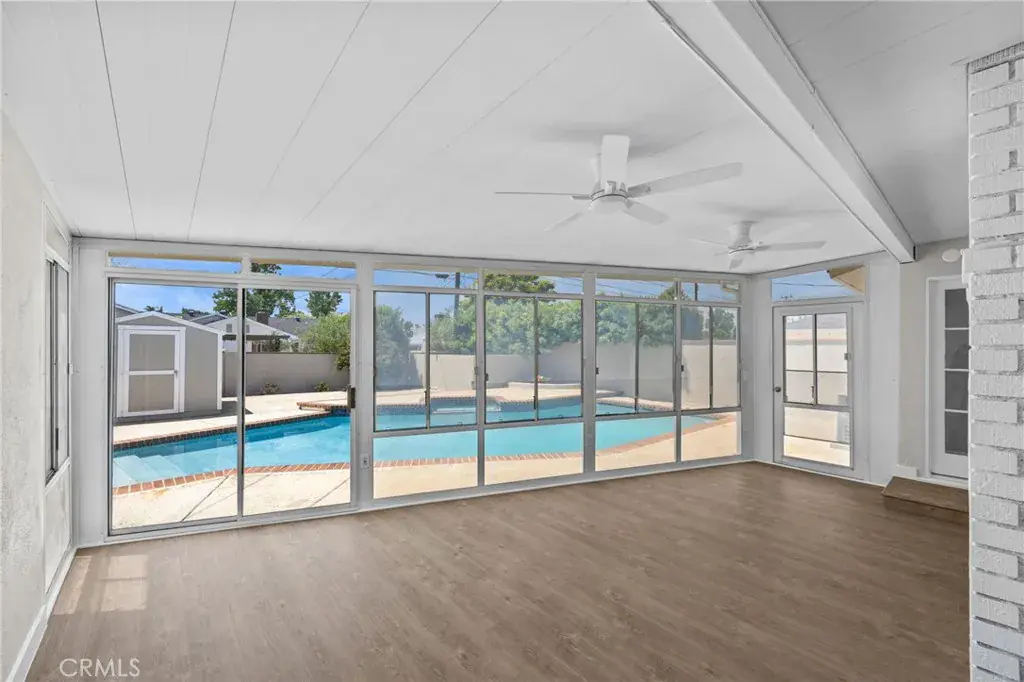 Down the hall are 3 bedrooms and 2 updated bathrooms. The hall bath offers a walk-in shower, while the second bathroom includes a tub/shower combo and dual vanities. The dedicated laundry room adds convenience with built-in cabinets and a utility sink. A large enclosed patio with ceiling fans gives you bonus space for a gym, playroom, or lounge area.