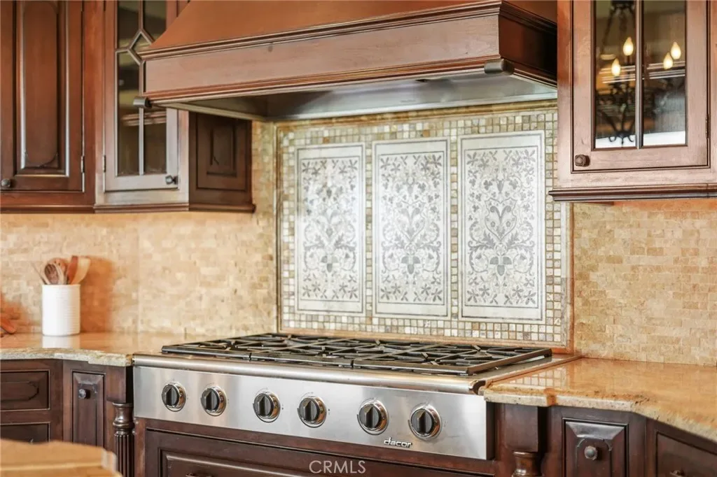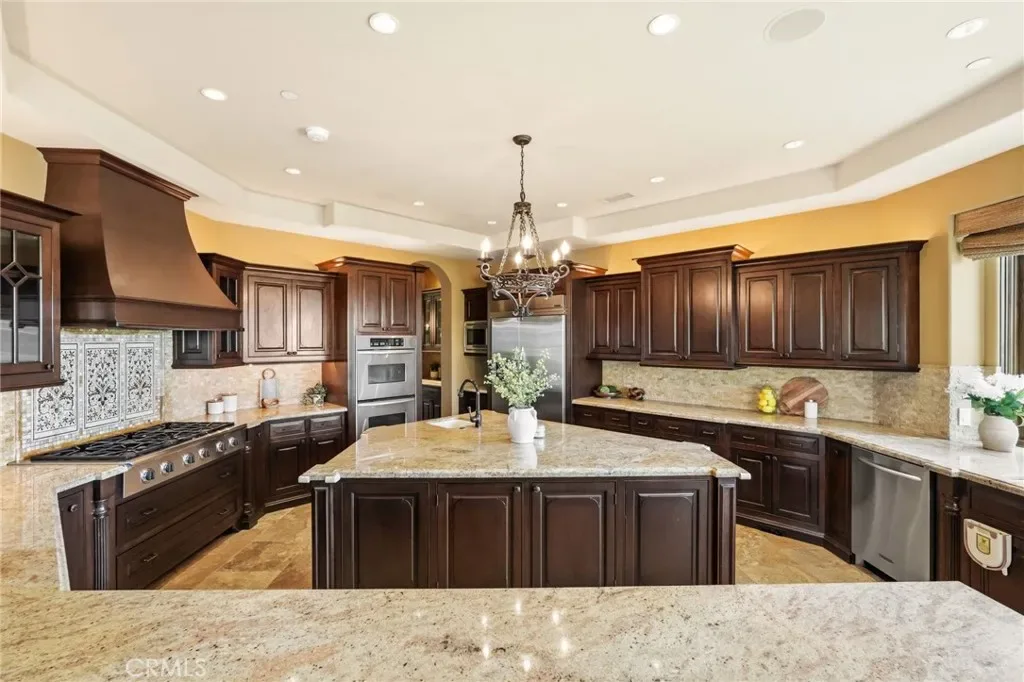 The chef’s kitchen features a large center island, granite countertops, premium appliances, and butler’s pantry, flowing seamlessly into the breakfast area and inviting family room—perfect for effortless entertaining.