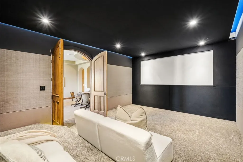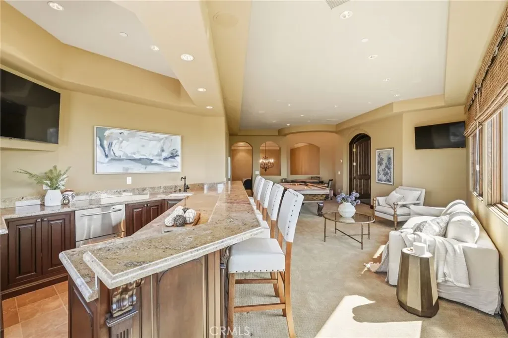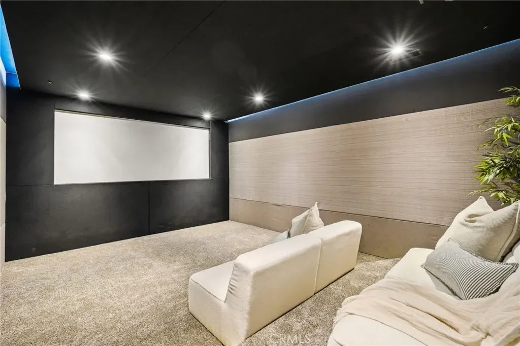 Upstairs offers two additional en-suite bedrooms, a second laundry room, and a spacious bonus room with game table niche, large wet bar, and rooftop deck capturing sweeping views. A state-of-the-art home theater with leather seating, floated walls, enclosed equipment, large screen, and immersive sound system completes the home’s impressive entertainment offerings.