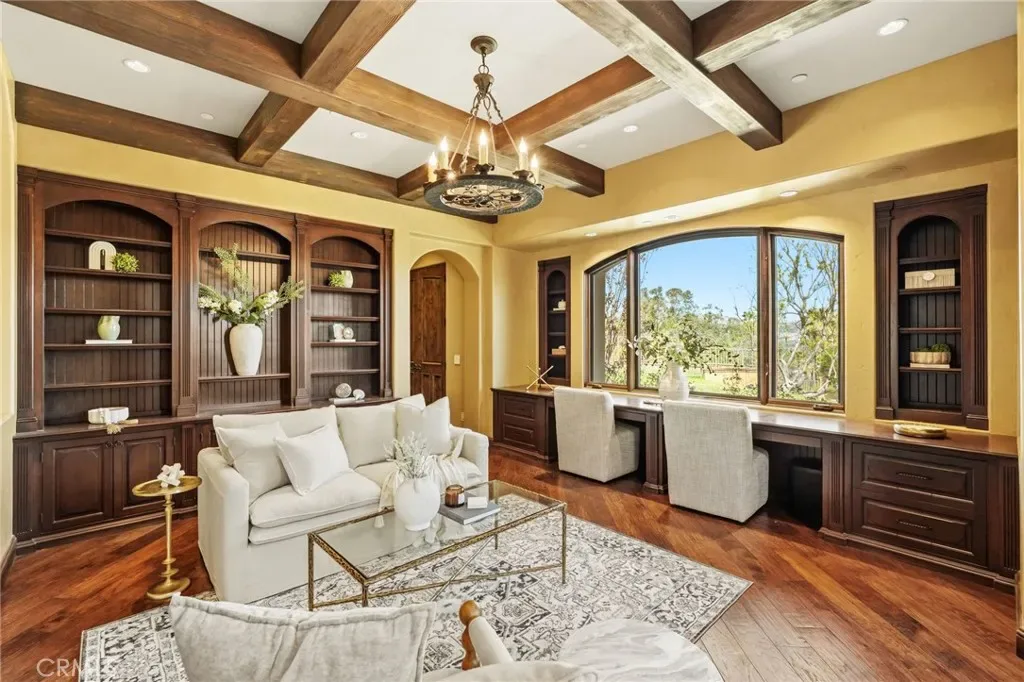 The main-level primary suite is a private retreat with dual custom walk-in closets, dual walk-in showers, separate vanity areas, and a soaking tub with beautiful tilework. Two additional en-suite bedrooms are located on the first floor, along with a private office featuring custom built-ins and large windows overlooking the scenic views of Orange Park Acres.