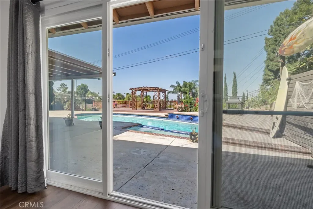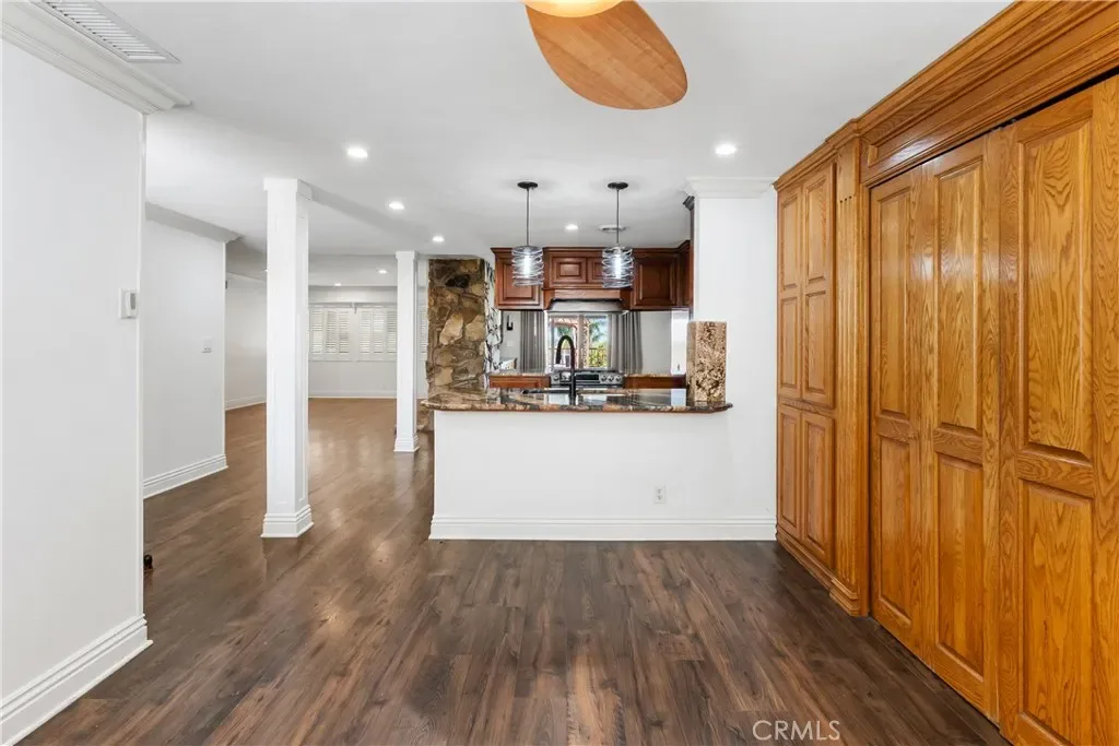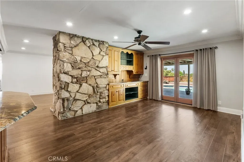 Inside, warm walnut-toned laminate flooring, recessed lighting, custom trim, and elevated finishes flow throughout. The living room is anchored by a natural gas fireplace and is pre-wired for media—perfect for both relaxing and entertaining. The dining area features a built-in bar with seating and dual French doors with sidelights that overlook the resort-style backyard, creating an ideal indoor-outdoor connection.