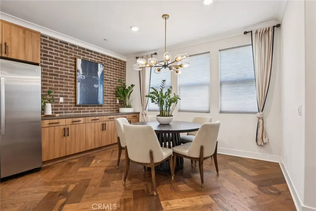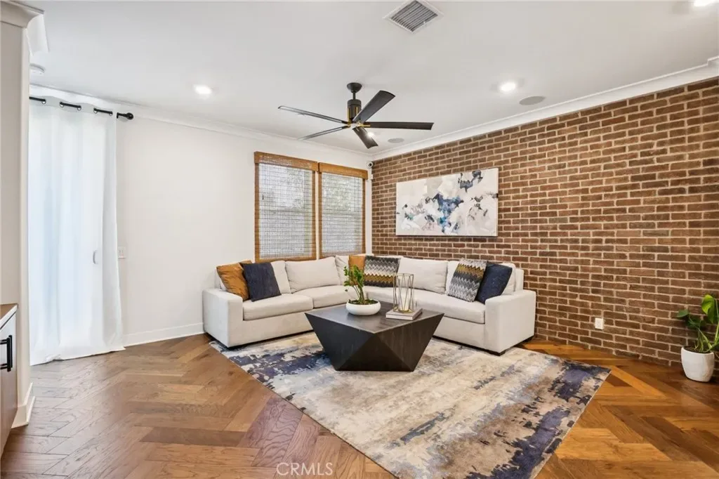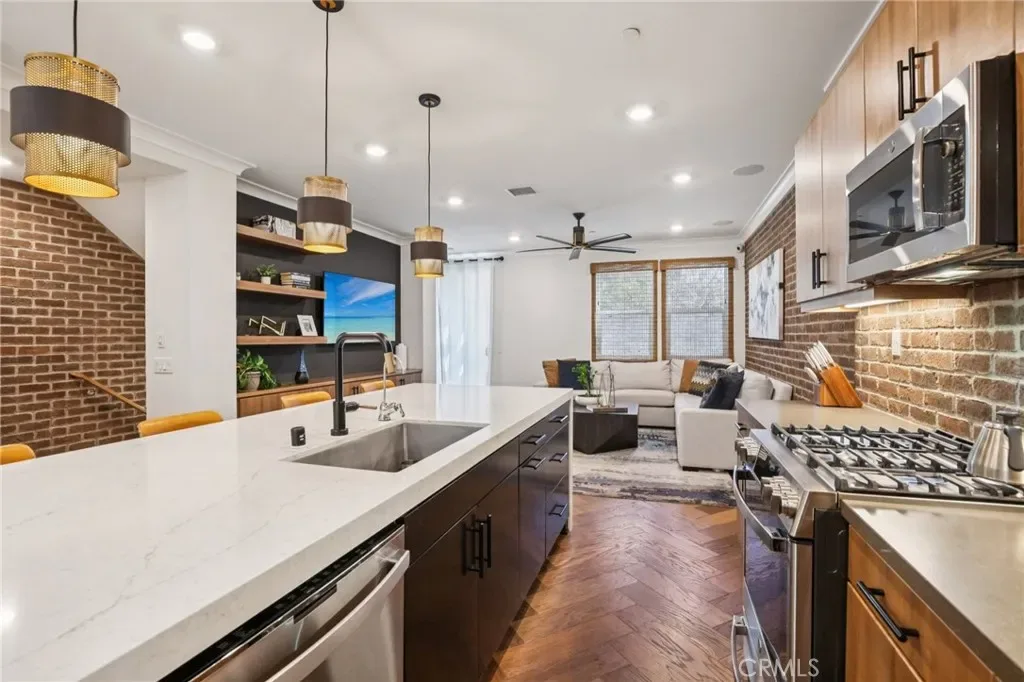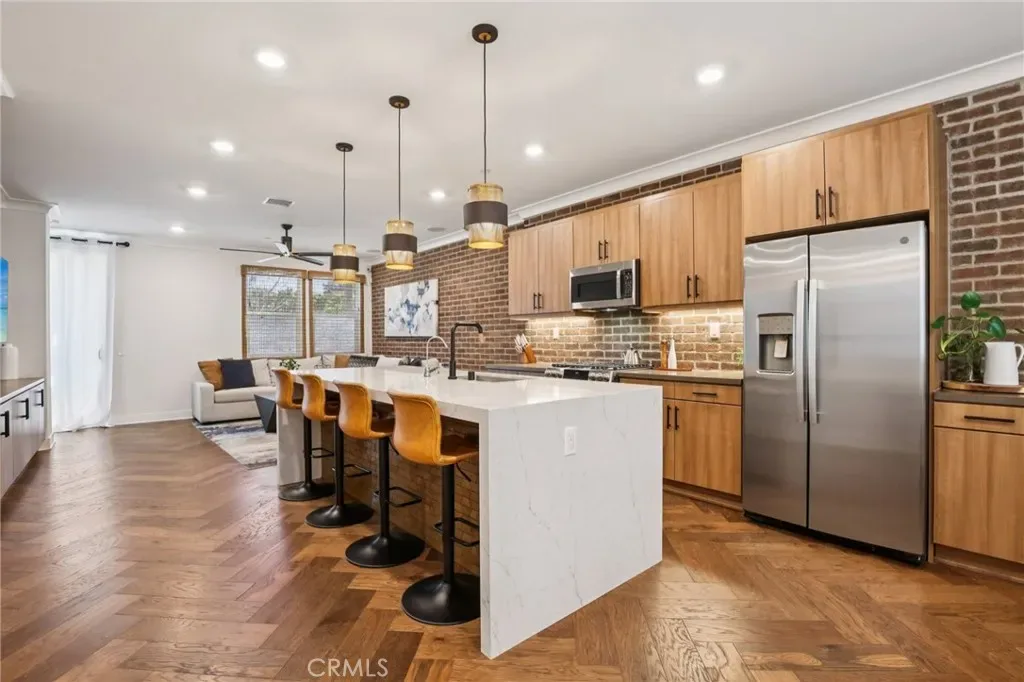 FORMER MODEL HOME in the prestigious ParkerOne community by TRI Pointe Homes in Orange. Thoughtfully curated with designer upgrades throughout, this stunning residence is the perfect blend of modern elegance and everyday luxury. Enter through the covered porch and foyer, you’ll be captivated by earth-tone herringbone hardwood floors, custom window coverings, crown molding, and sleek surface-mount LED lighting. The main level offers a versatile den with a custom-built-in bookcase, floating shelves, wall sconces, and a quartz countertop — along with a beautifully appointed powder room featuring a pedestal sink, framed mirror, and full-height custom tile. Make your way upstairs to the heart of the home: an open-concept living and entertaining level designed to impress. The chef’s kitchen is a showstopper, featuring quartz countertops with a full brick backsplash, a waterfall-edge island tiled at the face, shaker cabinetry in Graphite Nero, a Brizo matte black and luxe gold faucet, and premium stainless steel appliances. A walk-in pantry, guest powder room, and a private deck. The dining area and living room continue the sophisticated aesthetic with Lausanne flat-panel cabinetry, brick wall treatments, decorative pendant lighting, a built-in media cabinet with floating shelves, and a modern ceiling fan. The striking open-rail staircase — stain-grade with metal tubular balusters and brick wall accents — leads to the top floor, where the primary suite awaits soaring wood beam ceilings, gold-finish pendant lighting. Dual vanities with quartz countertop and full-height tile backsplash, a floor-to-ceiling custom tile shower with a frameless 3/8” glass enclosure, and a walk-in closet. The secondary bedroom suite is equally refined, offering a gold-finish fixture, quartz countertop, polished-edge mirror, and Lausanne cabinetry. A spacious laundry room with tile flooring and upper cabinetry. This smart home is equipped for modern living with Amazon voice-controlled entry, Ring video doorbell, Leviton Smart Wi-Fi switches, a Wi-Fi-enabled garage door opener, and a Honeywell programmable thermostat. Additional highlights include a tankless water heater, an attached two-car garage with EV charger, OWNED SOLAR, and NO MELLO-ROOS. Enjoy resort-style amenities with a low HOA that includes access to a community pool and cabanas. Ideally situated near CHOC, St. Joseph Hospital, Chapman University, and the charming shops and dining of Old Towne Orange. YOUR DREAM HOME!