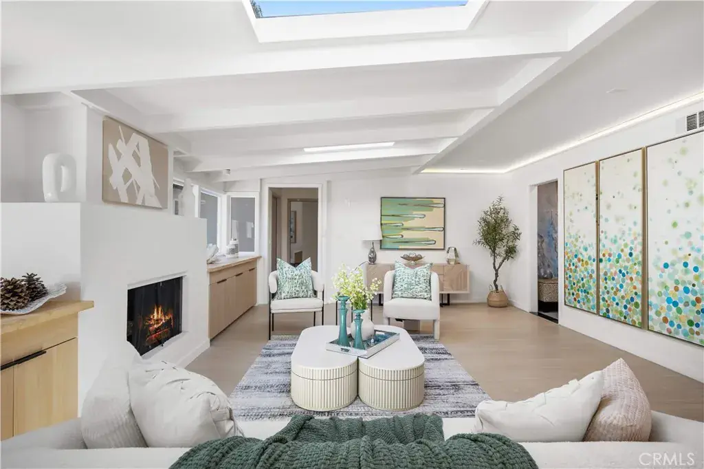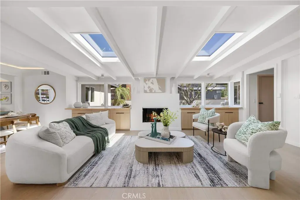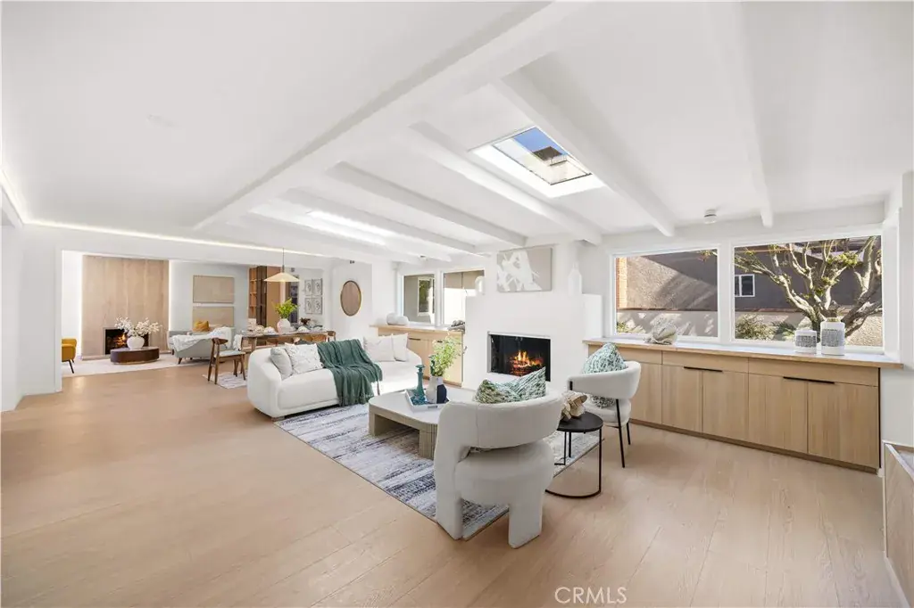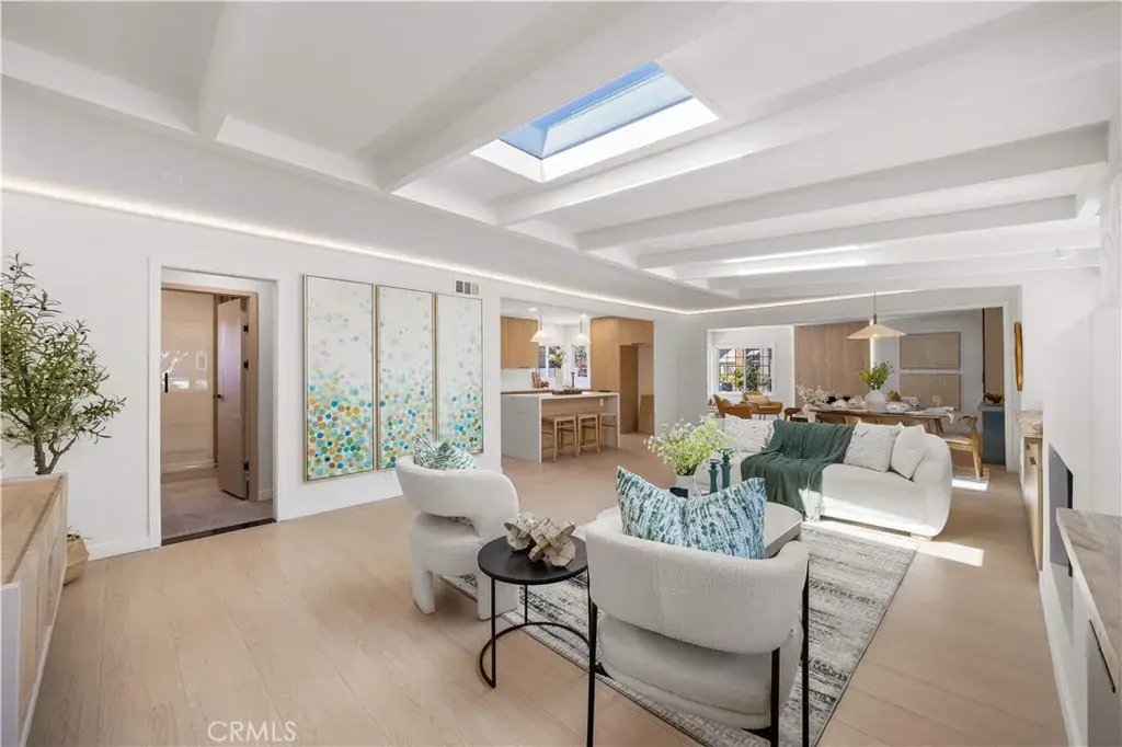 Just beyond the dining room is an inviting family lounge highlighted by dramatic double skylights, exposed ceiling beams, and a second fireplace — creating a cozy yet airy retreat filled with natural light. From this family room, sliding access opens directly to a private courtyard, offering a seamless indoor-outdoor connection ideal for morning coffee or evening relaxation.