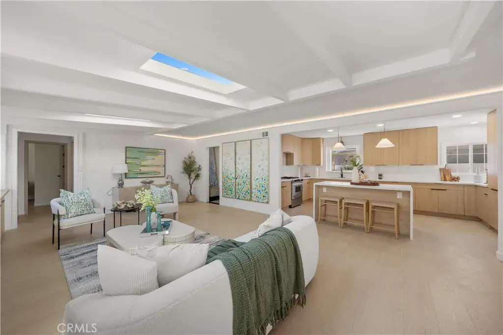 The layout flows effortlessly into a spacious dining area and a beautifully redesigned kitchen featuring custom cabinetry throughout, minimalist wood finishes, and a generous center island designed for gathering. Every detail has been curated to blend warmth with modern simplicity.
