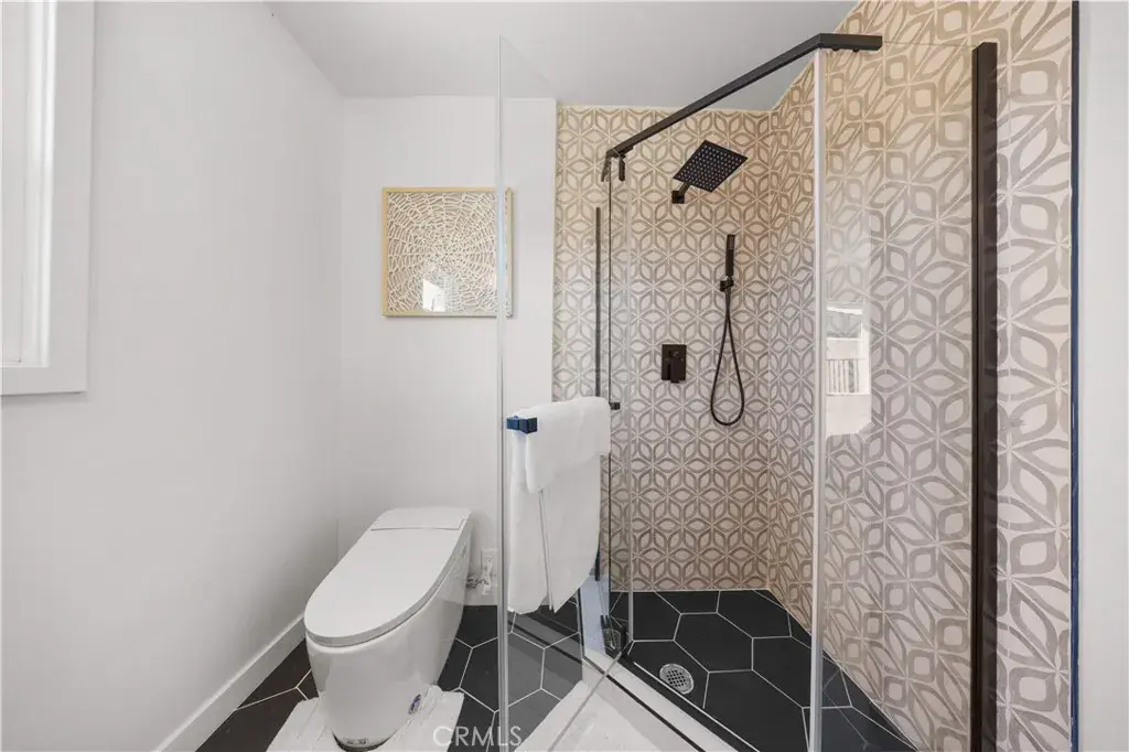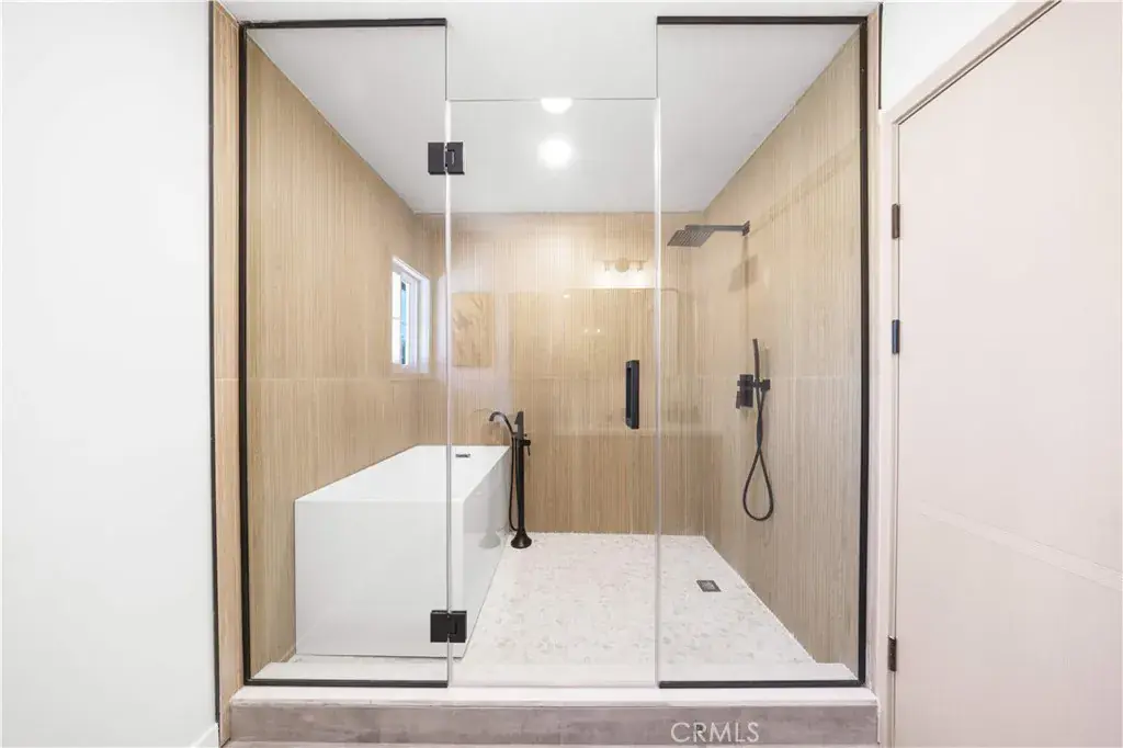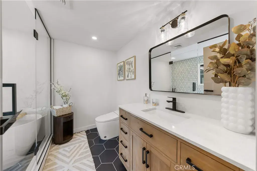 The home features three bedrooms and three full bathrooms, including two spacious primary suites — a rare and highly desirable configuration in the neighborhood. The spa-inspired primary bath showcases a large walk-in shower and a freestanding soaking tub, delivering a true retreat experience.