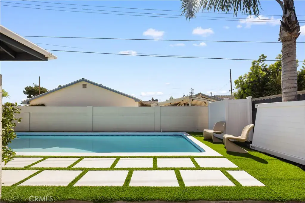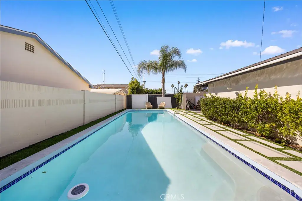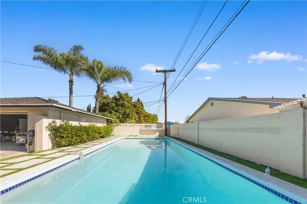 Set on an expansive 8,032 sq ft lot, the backyard is designed for California outdoor living. A long, modern rectangular pool is framed by clean landscaping lines and low-maintenance turf, creating a resort-like setting. A built-in BBQ area at the rear of the yard makes outdoor entertaining effortless.
