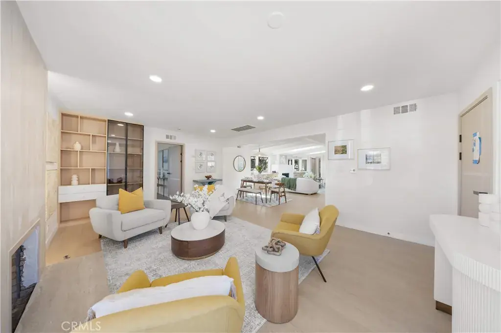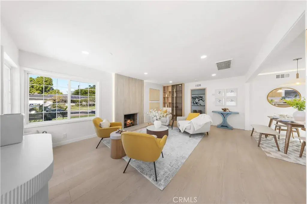 Upon entry, you are welcomed into a warm living room anchored by a sleek fireplace and framed by custom built-in cabinetry, offering both architectural character and functional elegance. Clean lines, wide-plank flooring, and abundant natural light create an immediate sense of calm and home.