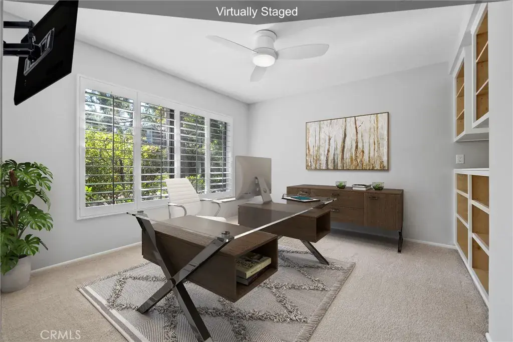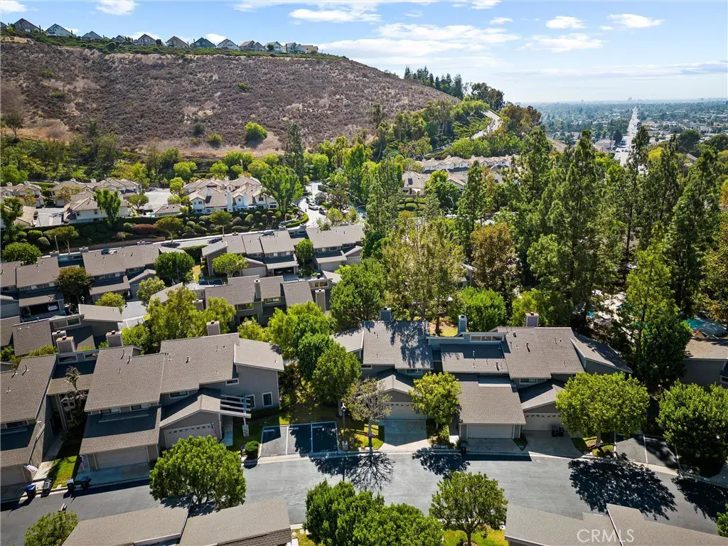 Tucked within the sought-after Chapman Townhomes community, this elegant end-unit townhouse-style address offers a rare blend of serenity and convenience, with a tranquil stream just beyond the private patio and rolling hill views as your daily backdrop. A dramatic double-door entry opens to soaring beamed ceilings, tall windows, and a light-filled open floor plan enhanced by brand-new high-end carpet and window shutters throughout, complemented by a sizable downstairs office or bonus room plus 3 generously sized bedrooms upstairs. The kitchen is thoughtfully appointed with stainless steel appliances, a gas cooktop, breakfast bar, and included refrigerator. The spacious primary suite features a walk-in closet, dual vanities, a sit-down makeup station, and glass-enclosed shower. A newly remodeled secondary bathroom adds a fresh, modern touch. Additional highlights include laundry appliances, an attached direct-access garage, and ample guest parking. Canyon Hills is known for its winding ponds and streams, resort-style pool and spa, and tennis courts, all just minutes from Old Towne Orange, local shopping and dining, major freeways, and nearby parks and trails, making this home as convenient as it is captivating.