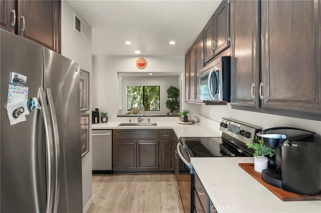 Situated in the sought-after hills of Orange, this stunning architectural residence delivers elevated living with refined design and inviting spaces. Upon entering this two-bedroom two and a half bath home, you’re immediately greeted by an open-concept layout with multiple levels featuring a spacious living room with a sliding door that opens to a patio overlooking a green belt with mature trees, perfect for indoor-outdoor living. Expansive windows fill the home with an abundance of natural light, enhancing its warm and inviting atmosphere. The second level overlooks the living room and features a formal dining room area, kitchen has quartz countertops and stainless steel appliances, and flows into a versatile family room or office space with sliding doors leading to a spacious balcony. A separate landing provides the perfect space for a small office or reading nook. Both bedrooms are oversized ensuites, offering ample space, privacy, and an abundance of natural light. Additional highlights include a direct access 2 car garage, inside laundry and a half bath for guests. Home is located near Santiago Oaks Regional Park trails, hiking and bike trails. Resort style pool, spa and barbecues along with another pool and spa just for Stream House residents.