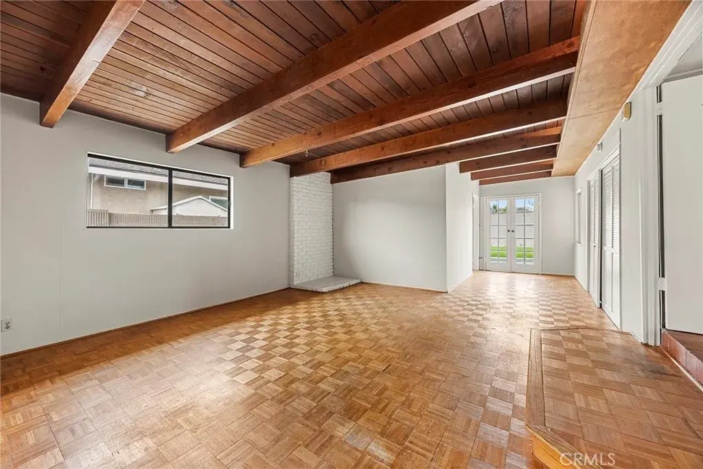 The kitchen continues into a dedicated laundry area with direct access to the backyard, adding everyday convenience. A formal dining room provides the perfect space for gatherings and special occasions. At the rear of the home, step down into a large bonus or family room showcasing wood floors and charming beamed ceilings, with direct access to the backyard—ideal for entertaining or creating a cozy retreat.
