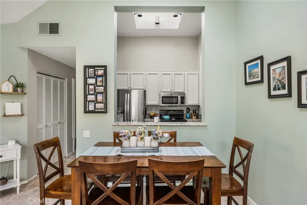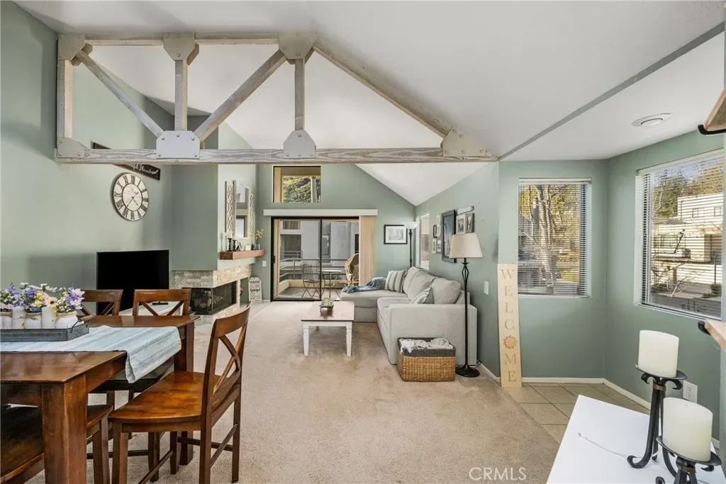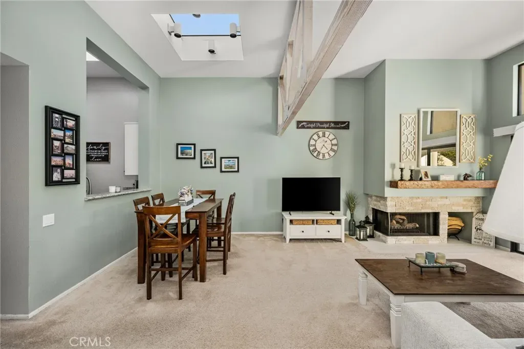 Step inside to discover a bright and open floor plan featuring dramatic vaulted ceilings, oversized skylights that fill the home with natural light, and a cozy fireplace that serves as the centerpiece of the living room. The spacious dining area flows seamlessly from the kitchen and offers convenient bar-top seating, creating a comfortable space for both everyday living and entertaining.