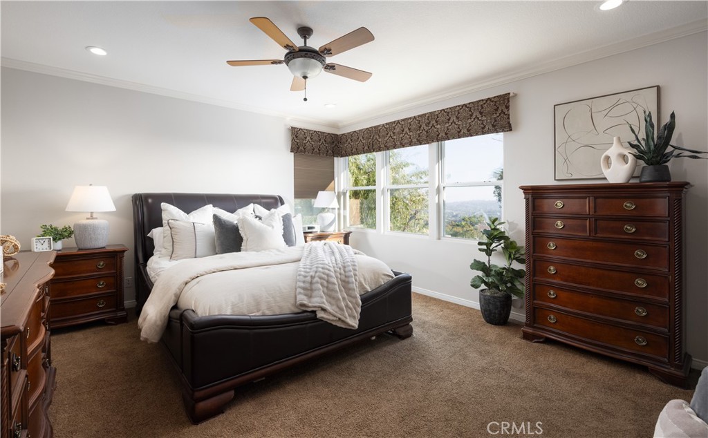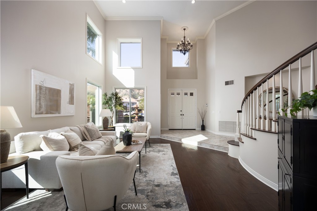 HILLSIDE VIEW HOME | PANORAMIC VIEWS | PRIVATE BACKYARD RETREAT | CUL-DE-SAC LOCATION | GATED PARKRIDGE COMMUNITY | Situated on a premium view lot within the prestigious gated community of Parkridge, this exceptional 5 bedroom, 4 bathroom residence offers 3,039 sqft of living space, blending privacy, comfort, and breathtaking scenery. Tucked away on a quiet cul-de-sac, the home delivers a rare sense of tranquility, with panoramic views stretching across city lights, rolling hills, and distant mountain ridgelines, extending toward Catalina Island and the ocean on clear days. From the moment you enter through the double front doors, a grand entry with soaring ceilings, expansive windows, and a sweeping staircase creates a dramatic first impression while filling the home with natural light. The formal living and dining rooms provide inviting spaces for entertaining, enhanced by large sliding doors that create a seamless indoor-outdoor connection. The kitchen serves as the heart of the home, featuring granite countertops, rich wood cabinetry, a center island, and a window framing the backyard and views. A breakfast nook and walk-in pantry enhance function, while the kitchen opens to the family room with a beautiful fireplace and built in bookcase. A main-level bedroom and full bathroom offer flexibility for guests or multigenerational living, along with a laundry room and three-car garage. Upstairs, the primary suite offers sweeping views of city lights and rolling hills to the ocean, with a cozy fireplace and complemented by a spa-inspired bath with dual sinks, soaking tub, walk-in shower, and two walk-in closets, plus an adjacent retreat ideal for an office, gym, or lounge. Additional bedrooms are generously sized, along with a bonus room or optional fifth bedroom. The backyard showcases the home’s elevated setting with a beach-inspired pool and spa, seating areas, outdoor fireplace, and built-in BBQ, all positioned to capture the views and create a private retreat. The property is located within a secure gated community featuring a neighborhood pool, spa, and sport court as well as being near top-rated schools, dining, and shopping. This is more than a home. It is a lifestyle defined by breathtaking views, privacy, and timeless elegance.
