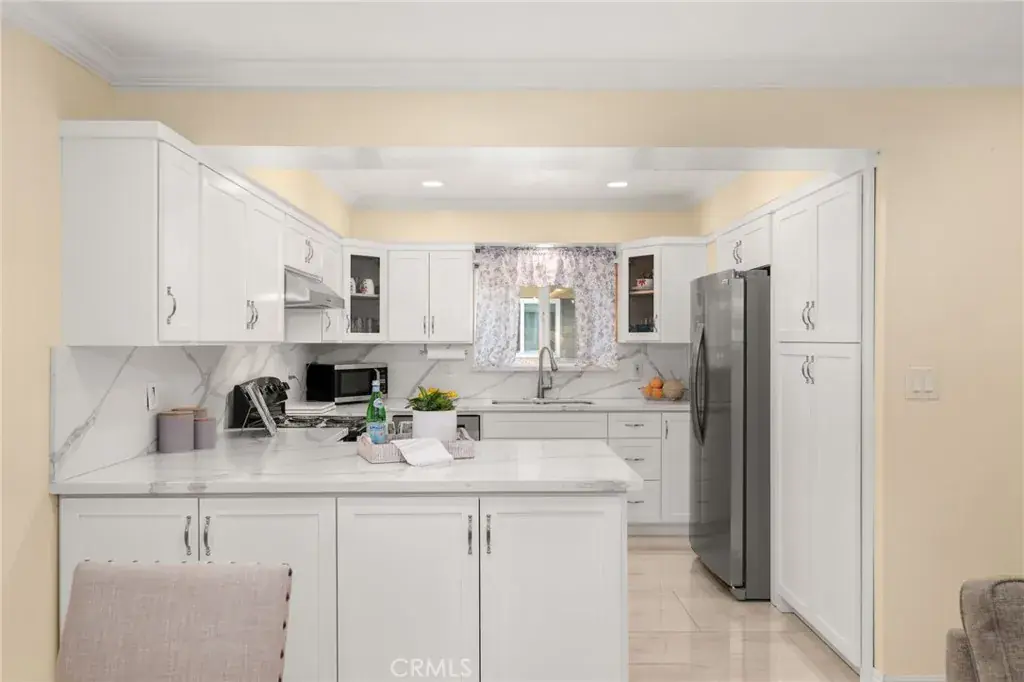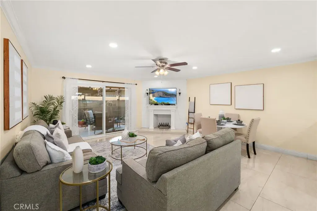 The bright living room features a cozy fireplace and flows seamlessly into the dining area, creating an inviting space for relaxing or entertaining. Sliding glass doors open to a private, fenced patio, perfect for morning coffee, outdoor dining, or quiet relaxation. The upgraded kitchen combines functionality and style, featuring quartz countertops, ample cabinetry, and newer appliances.