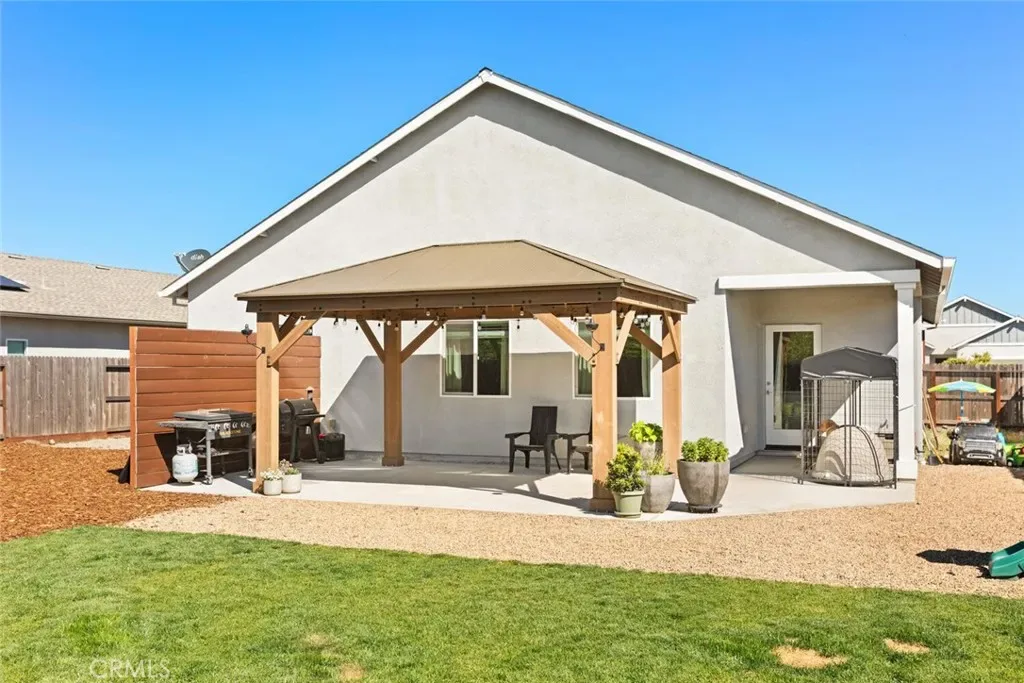 Nestled in a newer neighborhood, this beautifully updated home is a true decorator’s dream. From the moment you step inside, you’ll appreciate the modern finishes including soft neutral paint tones, luxury vinyl plank flooring, recessed lighting, ceiling fans throughout, stylish new wainscoting and a desirable open-concept layout. The spacious living room is the perfect place to gather and unwind, complete with a gorgeous fireplace that creates a warm and inviting atmosphere. The thoughtfully designed kitchen is sure to impress with its crisp white cabinetry, quartz countertops, gas range and a generously sized center island with breakfast bar seating—ideal for casual meals, morning coffee or visiting with guests while you cook. The private primary suite offers plenty of room to relax and features a walk-in closet along with an en suite bathroom complete with dual sinks and a large walk-in shower. Additional highlights include two spacious guest bedrooms, an indoor laundry room, abundant storage, updated light fixtures, an attached two-car garage and owned solar to help keep utility costs down. Step outside and discover a backyard made for summer enjoyment. Recently remodeled, it features a covered patio beneath a charming gazebo, fresh landscaping with lava rock and bark, a generous lawn area for outdoor fun and a full sprinkler system for easy upkeep. Located in a wonderful neighborhood in the charming town of Orland and just a short drive from Chico, this exceptional property is ready to welcome you home.