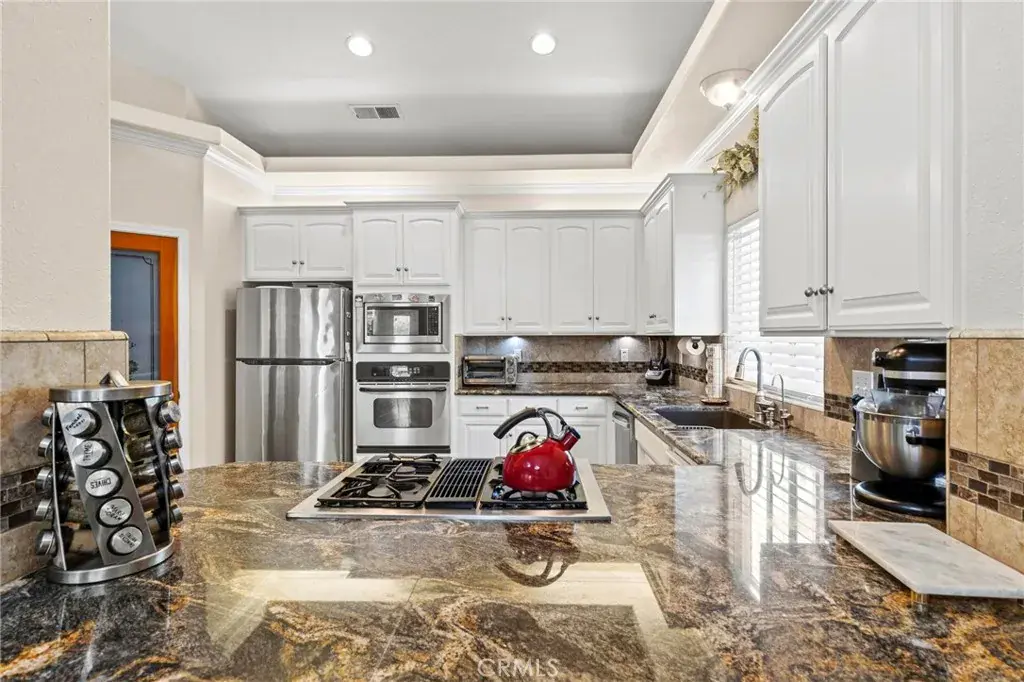Welcome to a truly exceptional residence that embodies refined living, timeless design, and everyday comfort. Nestled on a quiet cul-de-sac in one of the most sought-after neighborhoods, this elegant 3-bedroom, 2-bath home offers 2,107 square feet of thoughtfully designed living space on a beautifully landscaped 0.18-acre lot. Built in 2004, this residence seamlessly blends classic charm with modern amenities, providing an unparalleled living experience. From the moment you arrive, the home’s curb appeal is undeniable. A gracious wrap-around front porch sets the stage for the warm and inviting interior that awaits. Step inside to soaring ceilings, graceful crown molding, dual-paned windows, and an open floor plan that allows natural light to pour in, creating an atmosphere of airy sophistication. The main living spaces are accented by exquisite custom scraped wood flooring, while a tasteful combination of laminate and carpet provides texture and comfort throughout. The kitchen is a true showpiece, designed to delight the most discerning chef. Granite countertops, a decorative tiled backsplash, and an undermount double basin sink offer both beauty and function. A convenient pass-thru window with breakfast bar invites conversation, while a full suite of stainless appliances—including dual ovens (electric and convection), a microwave, and dishwasher—ensures effortless meal preparation. A spacious pantry completes the space, offering ample storage. The adjacent dining area is perfect for intimate dinners or festive gatherings, while the elegant living room—with custom built-ins and a cozy fireplace—creates a perfect setting for relaxation or entertaining in style. The private primary suite is a luxurious sanctuary, featuring a generous walk-in closet, spa-like soaking tub, expansive walk-in shower with dual shower heads, dual vanity sinks, and a private water closet. Guests will enjoy their own well-appointed bath with dual sinks, a tub/shower combination, and convenient linen storage. A dedicated indoor laundry room with extra cabinetry further enhances the home’s functionality. Step outside to your own personal oasis. The covered and tiled back patio invites alfresco dining and serene morning coffee, while the fully fenced yard with garden beds and lush landscaping offers a peaceful retreat. The attached garage provides ample space for vehicles and storage. A rare opportunity to own a home of this caliber—don’t let it pass you by.