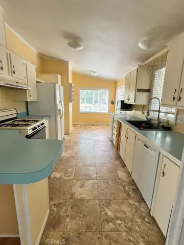 The second home is a 1BD/1BTH manufactured unit with modern vinyl flooring, new evaporative cooler, unique rounded kitchen, ramp access, and its private yard.