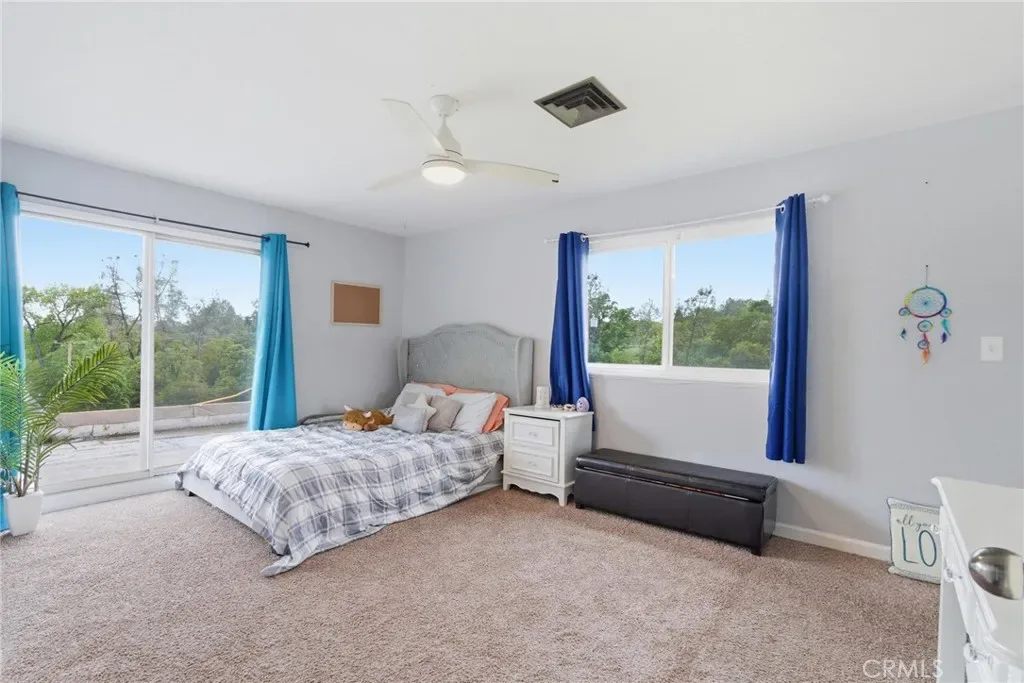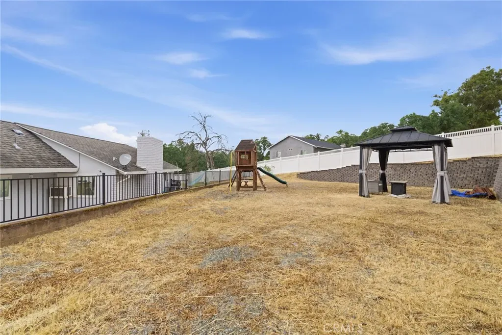 Experience the perfect blend of space, versatility, and resort-style living in this beautifully designed tri-level home, complete with owned solar and an entertainer’s dream backyard. Tucked into a peaceful, private setting yet just minutes from shopping, dining, and the scenic Oroville Lake & Dam, this property offers the ideal balance of seclusion and convenience. Step inside to a light-filled living room featuring soaring cathedral ceilings, a cozy fireplace, and dual sliding glass doors that seamlessly connect indoor and outdoor living. The backyard is truly a showstopper—highlighted by a large in-ground gunite pool with a diving board, slide, and play structure, plus a charming gazebo perched above. A built-in BBQ area and a dedicated poolside bathroom with a tile shower add both comfort and convenience for effortless entertaining. The kitchen is both functional and inviting, offering tile countertops, a breakfast nook, a walk-in pantry, and included stainless steel appliances. Just off the kitchen, a private lower level provides a flexible retreat, featuring the primary suite along with an additional room, perfect for a home office, gym, or nursery. With its own separate entrance, this space is well-suited for multigenerational living or added privacy. This level also includes a spacious laundry/utility room and direct garage access. Upstairs, you’ll find three generously sized bedrooms with ample storage, including one with direct access to a bathroom, ideal for guests or extended family. Additional highlights include a 3-car garage, covered carport with RV access and hookups, and an attached storage unit with a loft for even more functionality. The fully fenced property is enhanced with new vinyl privacy fencing, offering both security and peace of mind. Whether you’re hosting gatherings, enjoying sunny pool days, or unwinding under the stars, this property is designed for easy, everyday living with room to enjoy it all.