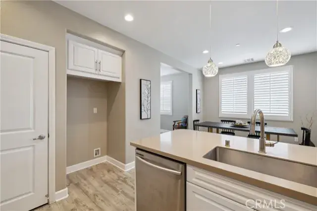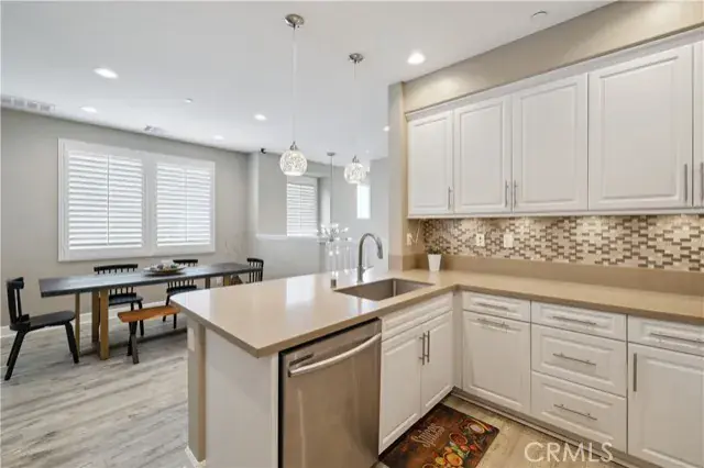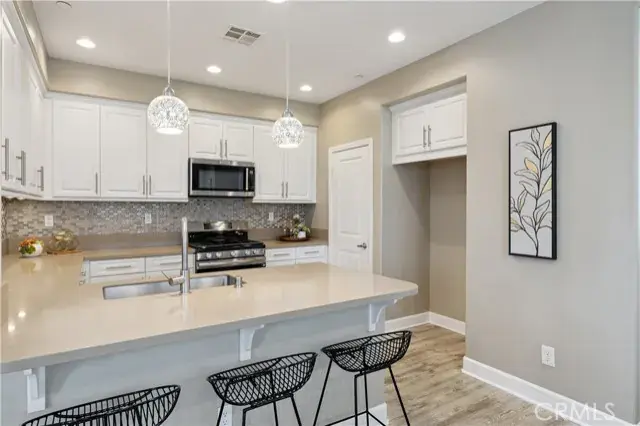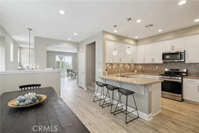 Highly upgraded, bright and spacious corner townhome, located in the well maintained Westerlies community, with immaculate 4 bedrooms (plus den/office), 3.5 bathrooms. Walking distance to Seabridge Marina, restaurants, shopping, Channel Islands harbor, and less than a mile to the beach! Featuring over 2,200sf of living space, this light and bright home offers countless upgrades including luxury vinyl flooring, and high-end finishings throughout. It’s unique west facing corner location (only one like it in the complex), welcomes an abundance of natural light through multiple windows, and unobstructed views out towards the coast and marina. Offering an ideal floorplan, 1 bedroom and 1 full bathroom are conveniently located on the first floor. The second floor features the living & dining room, butler’s pantry, large den, powder room and upgraded kitchen, quartz countertops, glass tile backsplash, custom cabinetry, and large walk-in pantry. From the living room, head out to the balcony to enjoy ocean breezes, fabulous sunsets, barbecues, and all while taking in the views. Three additional bedrooms located upstairs, including the impressive primary suite also featuring gorgeous views, huge walk-in closet, and spa-like bath with dual sink vanity, soaking tub, water closet, and walk-in shower. Separate laundry room conveniently located on top floor with plenty of storage cabinets. Additional upgrades include 2 zone HVAC, plantation shutters, recessed lighting, and oversized finished two-car garage with ample storage and epoxy floors.
