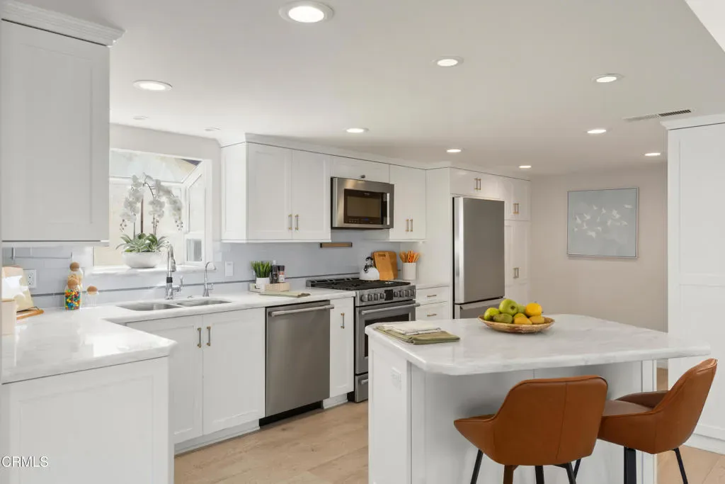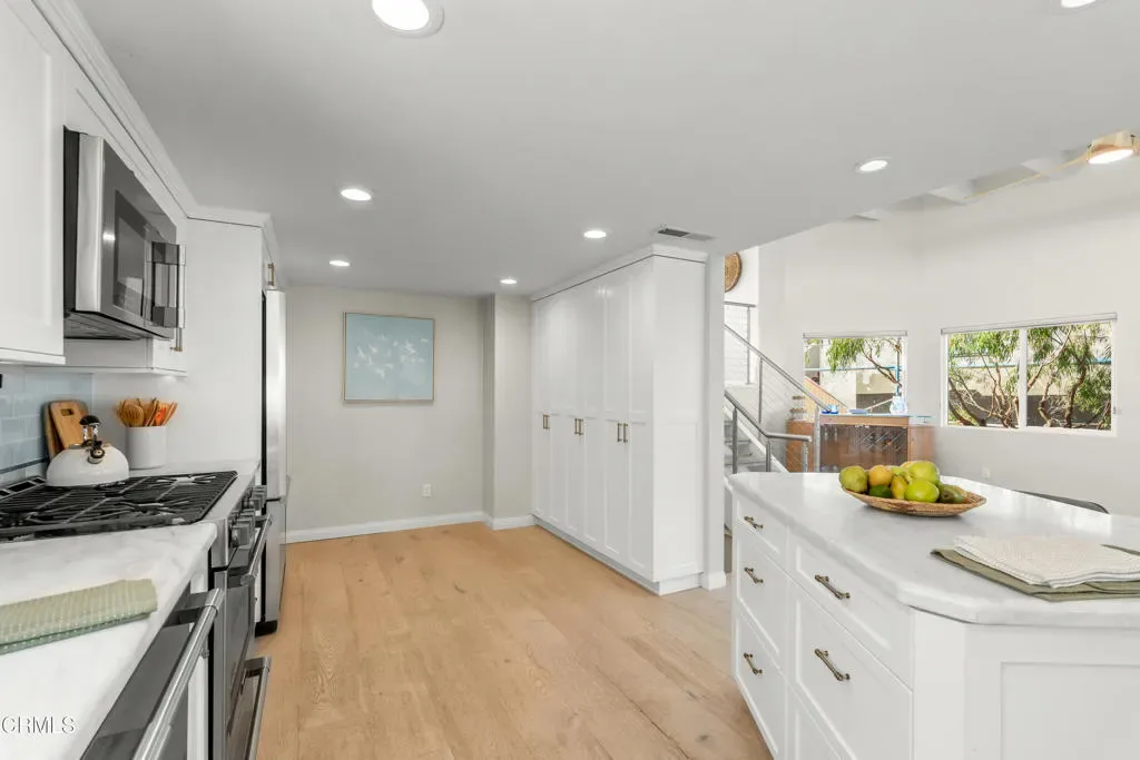 Welcome to Mandalay Shores, a beautifully remodeled coastal home with ocean views just steps from the sand. Designed for the ultimate Oxnard beach lifestyle, the home offers multiple decks for relaxing or entertaining while enjoying the spectacular sunsets that make this community so special.The first level is designed for flexible living and features two bedrooms, an updated bathroom, and a secondary kitchenette with living space — ideal for guests, multi-generational living, entertaining, or even a private movie room.Upstairs, the primary suite offers a private balcony, walk-in closet, and a beautifully remodeled Carrara marble bathroom. The family room features a gas fireplace, built-in storage, and a deck with ocean views, creating the perfect space for sunset gatherings or quiet mornings by the sea.The chef’s kitchen showcases all-new appliances, Carrara marble countertops, a center island, and thoughtful design that opens to the living room, family room, and oversized dining area, creating seamless indoor-outdoor flow for everyday living and entertaining.Recent upgrades include new flooring throughout, recessed lighting, ceiling fans, tankless water heater, mini-split HVAC system, upgraded electrical panel, and a new roof.Outside, the landscaped front and side yards provide space for outdoor dining, entertaining, or adding a spa, while the two-car garage offers convenience and additional storage.Located near Channel Islands Harbor, the home provides easy access to boating, kayaking, paddleboarding, golf, shopping, and local dining. Here, coastal charm, modern comfort, and Ventura County’s natural beauty come together to create a true beach retreat.