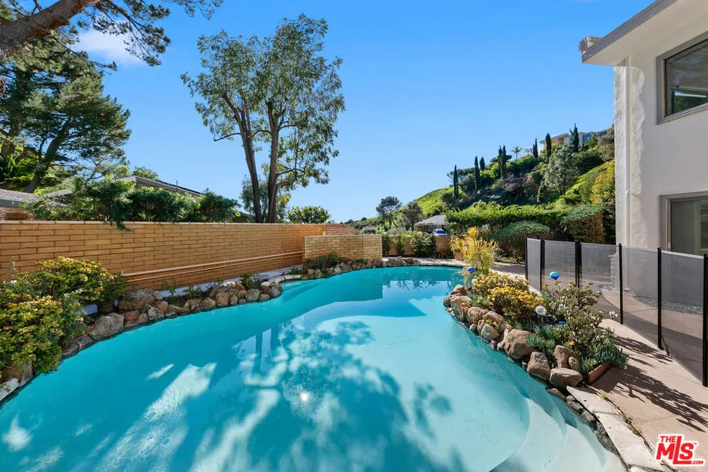 Tucked away at the top of a secluded cul-de-sac, this remediated and beautifully renovated home offers ocean and mountain views in a peaceful, private setting. The home sustained minimal fire damage and had since been thoughtfully remodeled and landscaped. Natural light fills every room, with windows and sliding doors opening to views of the ocean, pool, and greenery. The newly designed kitchen features modern fixtures, new cabinetry, stainless steel LG appliances, and direct access to the backyard. It is ideal for everyday living or hosting small gatherings. A spacious office/den on the main level with ample closets and direct access to the patio and pool provides flexibility for remote work or guest accommodations. Upstairs, the primary suite includes an en-suite bathroom, while two additional bedrooms share a spacious bathroom with double sinks, tub, and separate shower. Upstairs is newly carpeted, and all bedrooms are outfitted with blackout shades, creating calm, private spaces for rest and focus. Outdoor amenities include a newly resurfaced, heated pool with new equipment and safety fencing, a large patio for lounging and dining, a newly planted grassy backyard with lemon trees in the planters, and parklike hillside with mature trees and vegetation. Regular pool and gardener services are included in the rent and maintained by the owner, ensuring a low-maintenance lifestyle. Additional upgrades include a 200-amp electrical panel. Minimum lease term: 13 months. No short-term rentals.