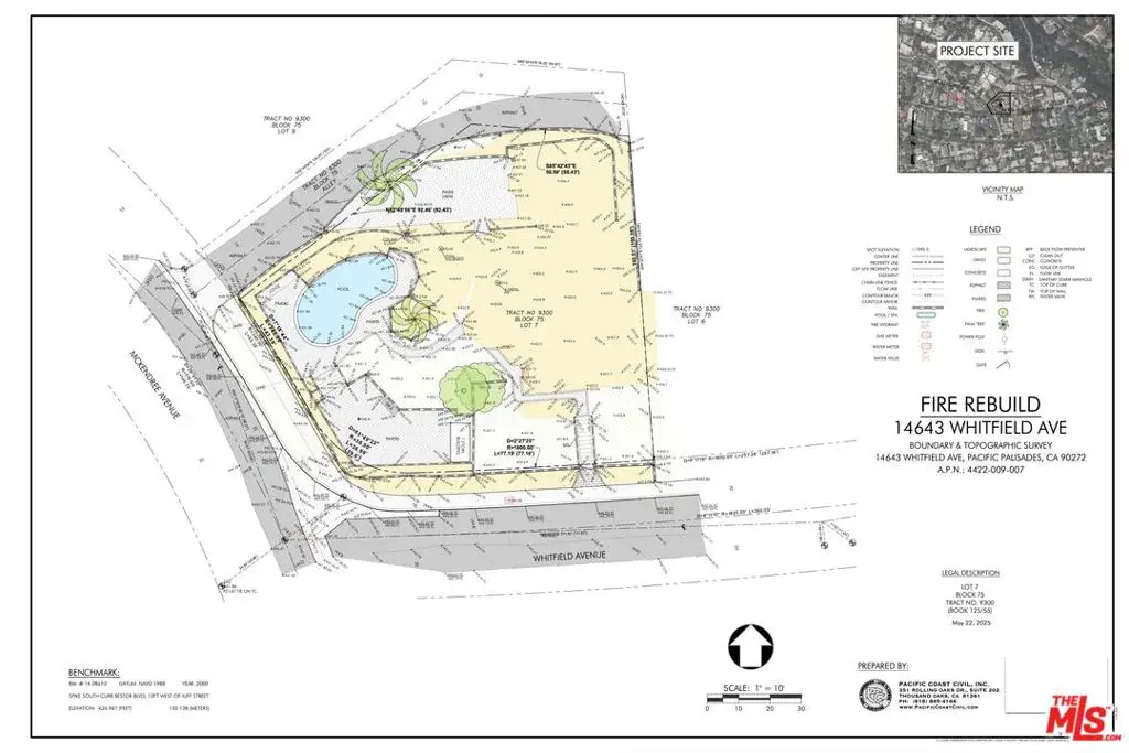 Rare 11,000 square foot mostly flat and elevated corner lot near the Palisades Village. The property is cleared and ready for brand new construction of a large 3-level new home – upwards of 9,000+ square feet under current building codes (not in the coastal commission zone). 14643 Whitfield Ave. sits above the Alphabet Streets and a new construction home will have breathtaking panoramic ocean views and a spacious backyard on its larger-sized lot. Additionally, this corner, coupled with a short road in the back, creates flexibility in designing the exact location of a garage. The property resides just moments from the Palisades Village known for boutique shopping and award-winning restaurants; top-rated local schools, scenic hiking/mountain biking trails, bike paths, and world-class beaches.Adding to this unique offering, this property was last on the market 65 years ago. This is not simply another Pacific Palisades land sale; it is a chance to claim a piece of Palisades history that is nestled within the coveted Chautauqua Heights subdivision, celebrated for its expansive lots and iconic ocean views. The previous/original home was the 53rd house ever built in the Palisades back in 1924, a residence cherished for generations. Its story speaks to permanence, heritage, and the timeless allure of this coastal enclave. And now it’s ready for the next chapter and will be part of the resurgence of the Pacific Palisades.EPA (Phase 1) remediation & debris removal (Phase 2) are both complete. The foundation has also been removed to prepare for new construction. New home builds are well underway in the neighborhood, with the Caruso Village set to reopen in 2026. Some schools are already back and some businesses are reopened, and others are slated to reopen. Once complete, the Pacific Palisades will be more beautiful than ever before as it’s still one of the most highly desired coastal enclaves in all of California.