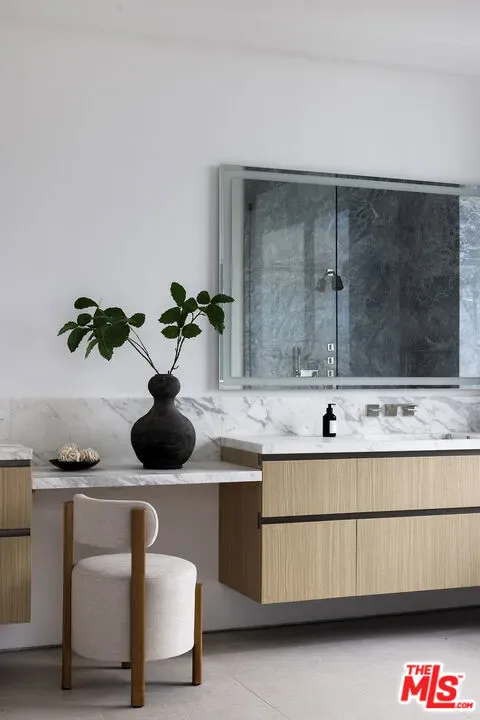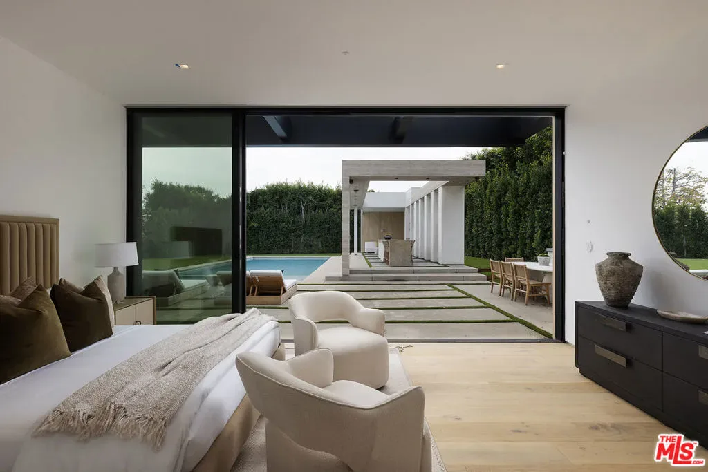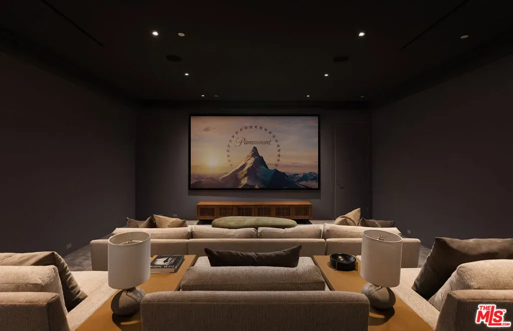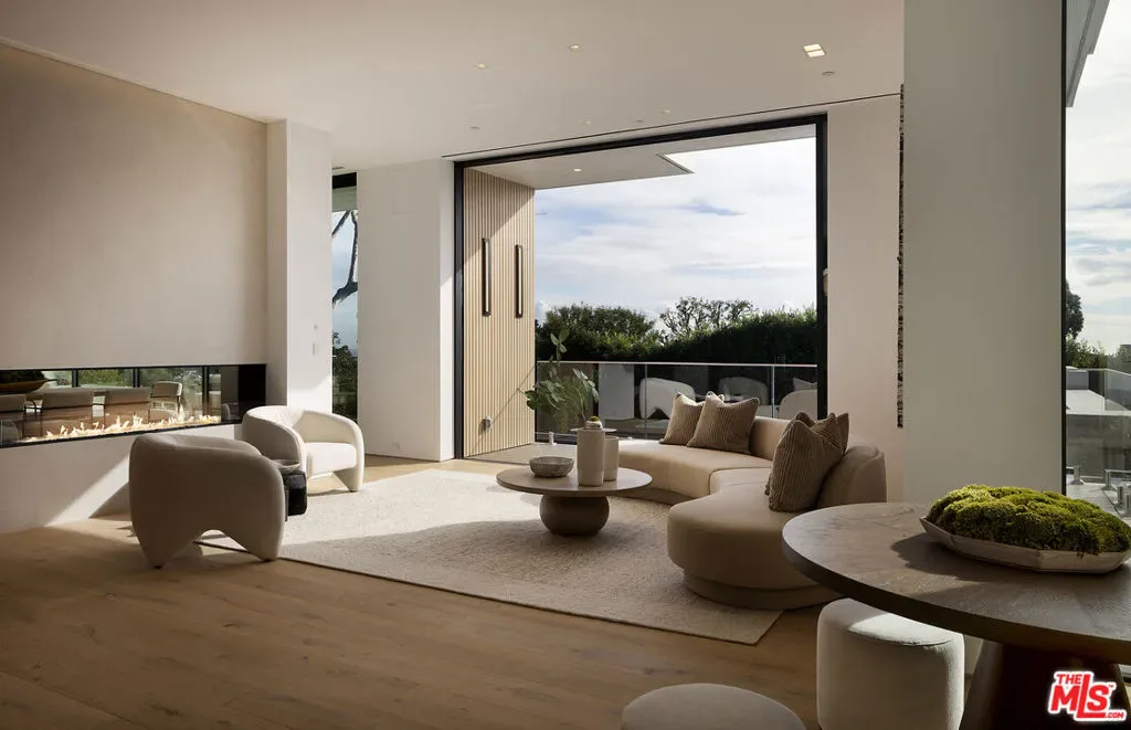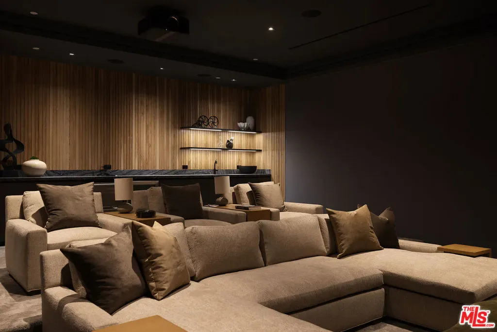 Presenting a masterful offering of exceptional design and architecture, newly completed in the coveted Upper Riviera of Pacific Palisades. Lush, carefully manicured trees and landscaping provide contrast to the home’s stone, metal, and glass facade, fusing the composition with its natural environment. An 11-foot-high pivot door welcomes guests into the light-filled foyer with a beautiful double-height space and wide-plank oak floors that can be found throughout the estate. At the center of the home there is a three-story floating staircase, flooded with natural light to illuminate each floor. Enjoy unique, premier amenities throughout, including two full wet bars on both entertaining levels, a car lift with Carousel USA turntable in the two-story garage, glass vehicle display, elevator, Fleetwood doors, and a total of 2,000 square feet of upper deck space. The gourmand’s kitchen includes chef-grade Gaggenau luxury appliances and a gorgeous Taj Mahal marble display wrapping the hood and flowing across backsplash and center island. There is also a caterer’s prep kitchen dressed in lady white marble. The primary suite has incredible volume with a book-matched fireplace and floor-to-ceiling glass that opens to striking ocean views from the 1,300-square-foot wraparound deck. The spa-inspired bath has a giant shower with soaking tub plus dual floating vanities with smart mirrors and makeup desk, and the large walk-in closet is equipped with custom built-ins and dresser island. The lower level has a sauna, gym, 640-bottle wine storage, large theatre with Silver Wave marble snack bar, and two secondary bedrooms that access the resort-like rear grounds. In the 9,000-square-foot backyard, discover a beautiful poolside pavilion with outdoor living room/cabana, 12-person dining space, barbecue, leatherized Belvedere marble bars, and fruit garden. Swim in the sparkling 20-foot by 50-foot pool with Baja shelf and spa, roam on the grassy lawn, or converse around the fire table, all enclosed by privacy hedges. Welcome to this prized Upper Riviera location, known for its fantastic panoramic vistas of the Pacific Ocean, Catalina Island, the Santa Monica Pier, Getty Center, fairways, and sprawling cityscape.