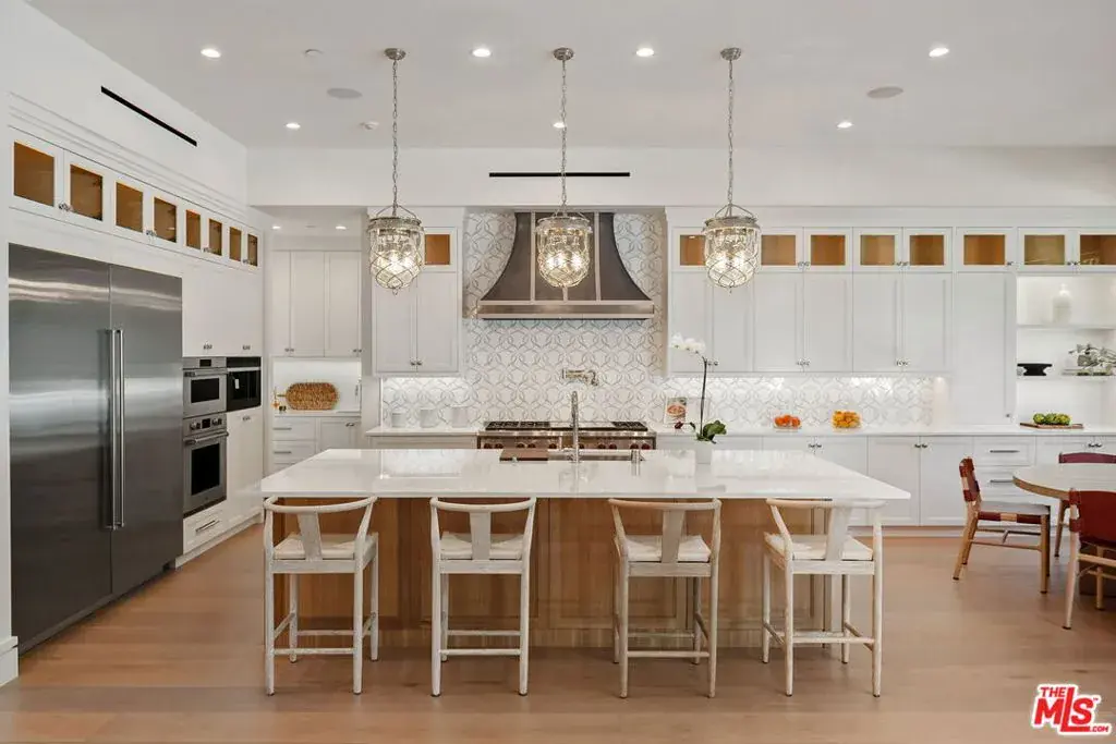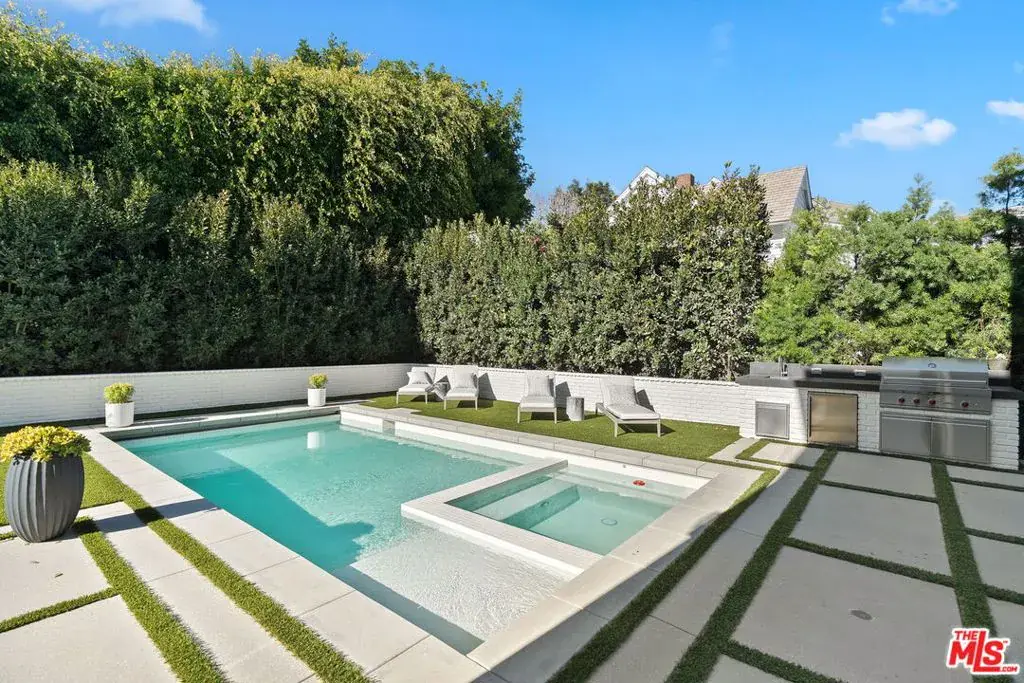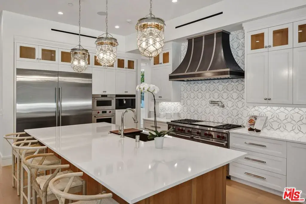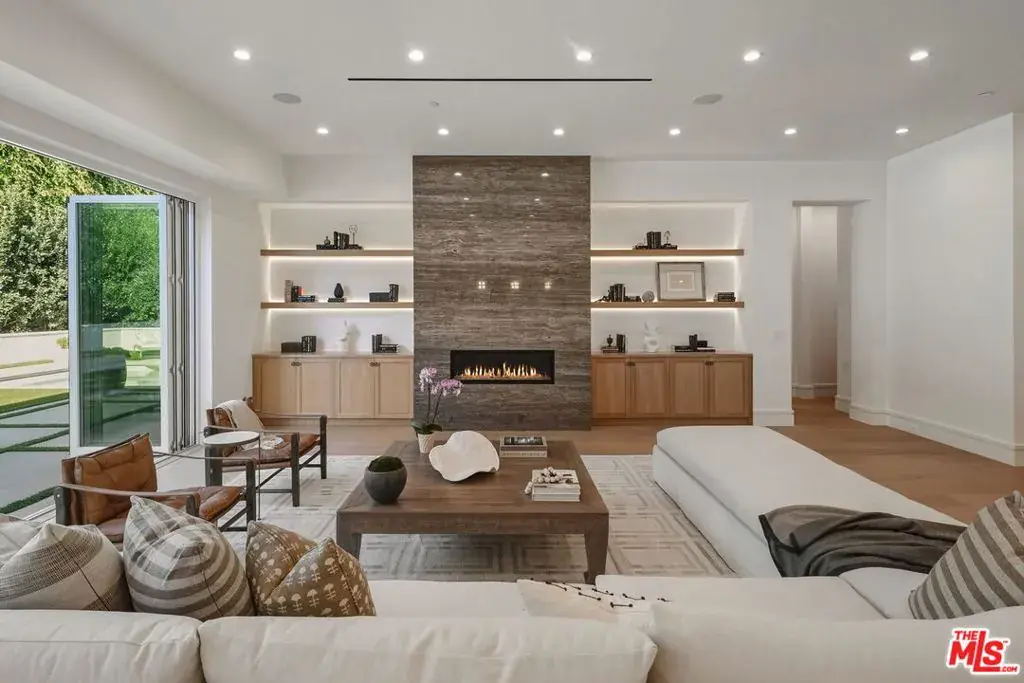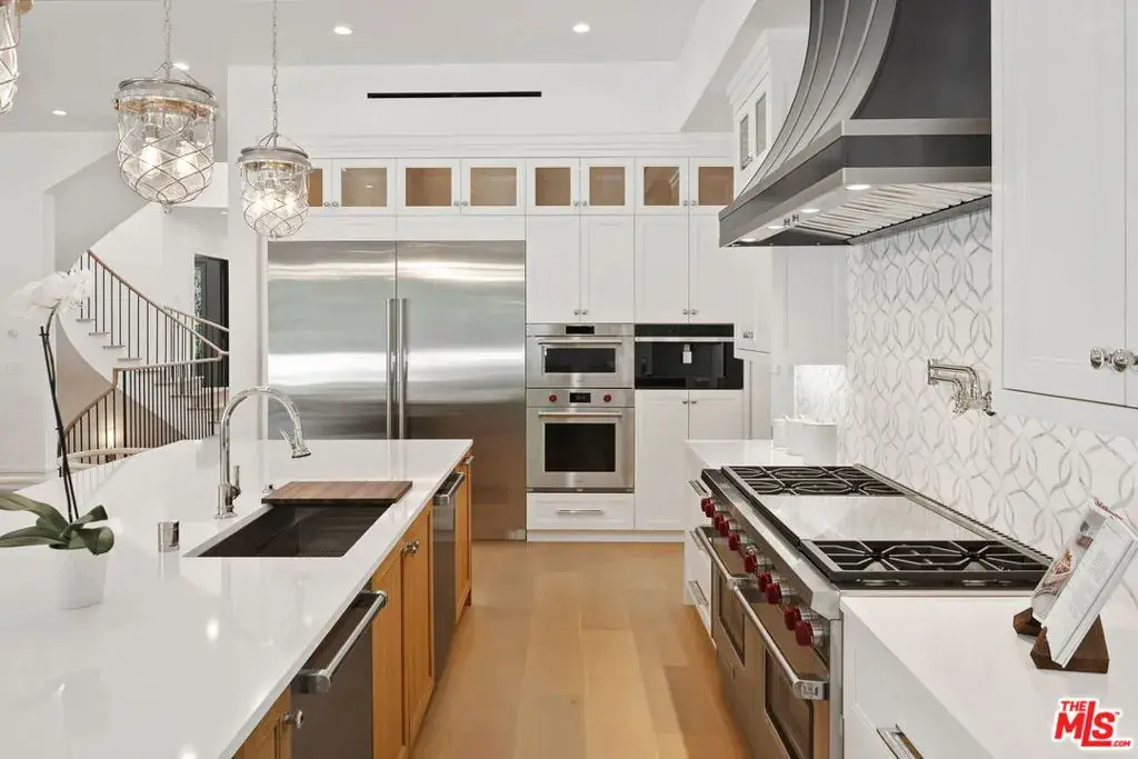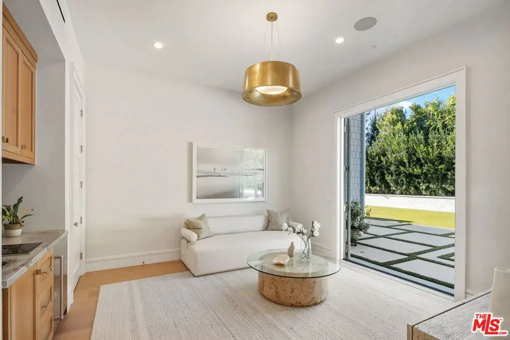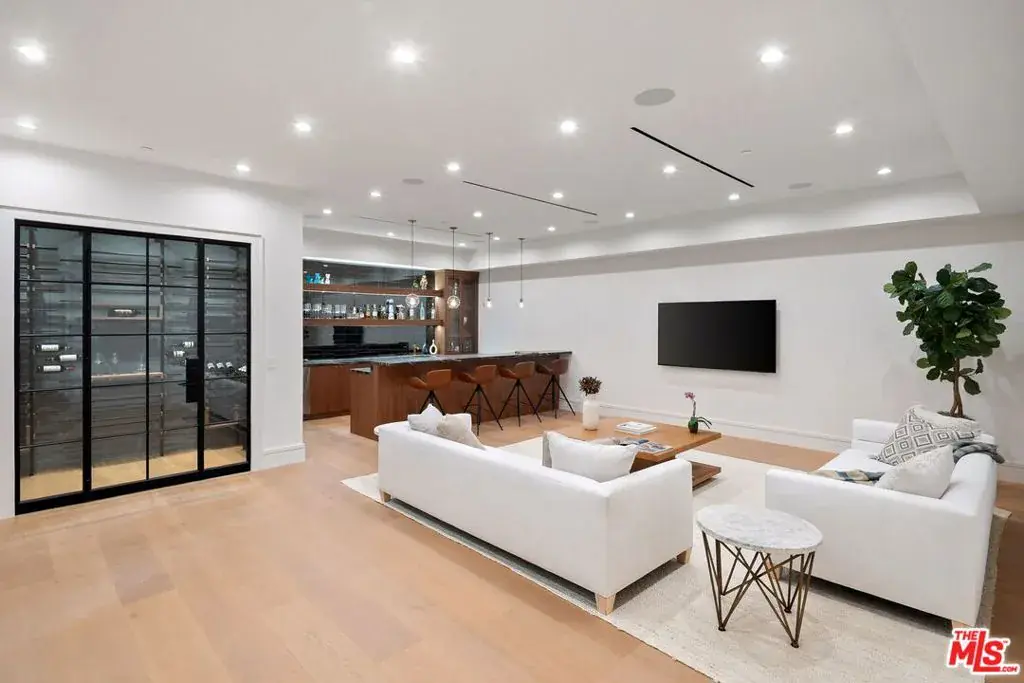 Brand new Hamptons-style Traditional home located in the prestigious Upper Riviera, one of the Westside’s most coveted addresses. Spanning approximately 7,850+/- sq. ft. , this residence offers 6 bedrooms inclusive of a main floor guest suite with sitting room and kitchenette. The home is designed with the finest finishes, combining timeless elegance with modern conveniences. The entry leads to a floating staircase, and opens to a grand living room and formal dining room area. There is also an office/study with floor-to-ceiling walnut cabinetry. The gourmet kitchen features a full Subzero/Wolf suite of appliances, oversized island, butler’s pantry, and a large walk-in pantry. The kitchen opens to a breakfast area and spacious family room with oak built-in cabinetry, and expansive La Cantina glass doors leading to the backyard. The home is finished with white oak floors throughout, a multiple-zone HVAC system, and full smart wiring adaptable to any owner’s needs. There is a Lutron lighting system, security system with multiple cameras, and Waterworks fixtures throughout. The upper level has a primary bedroom with fireplace, balcony, and spa-like marble bathroom featuring dual vanities, makeup area, oversized dual shower with multiple sprayers, two separate water closets both with Toto Washlet toilets, and a spacious walk-in closet. Three additional en-suite bedrooms with walk-in closets complete this level. The lower level is designed for entertaining with a state-of-the-art theater, large great room with bar, wine room, gym, guest/maid’s suite, and abundant storage. An elevator services all three floors. Mature landscaping ensures privacy while the salt-water pool, spa, and outdoor BBQ create a relaxing retreat. Additional amenities include a full three-car garage with two EV chargers. A rare offering in the Riviera, this special home blends traditional craftsmanship with contemporary luxury in one of Los Angeles’ most exclusive and quiet neighborhoods, providing a distinctive haven of tranquility.