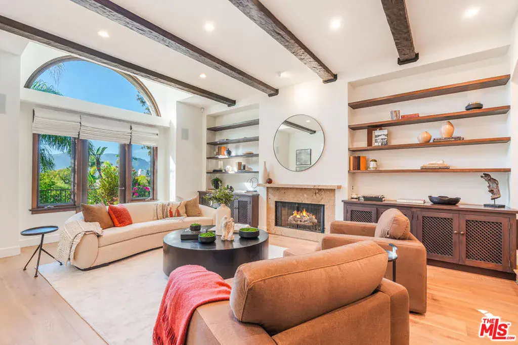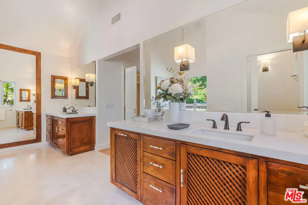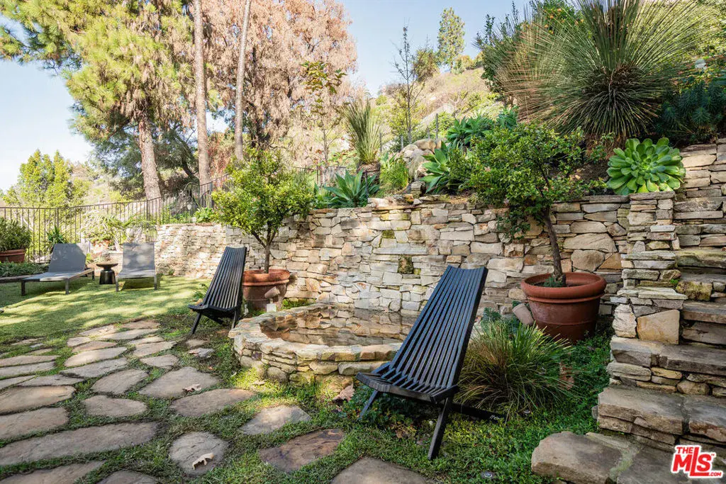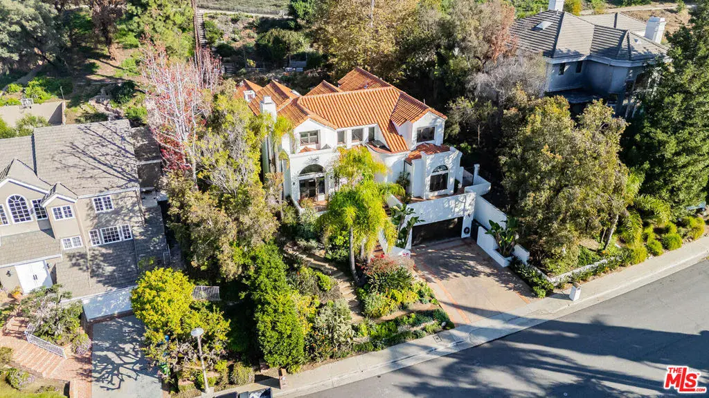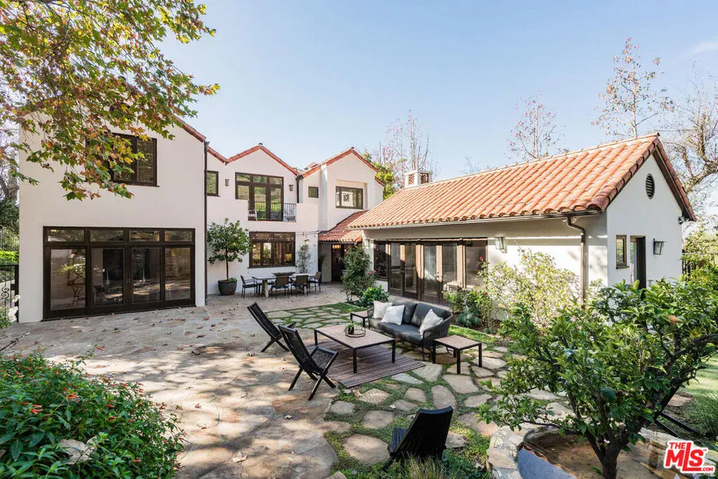 Experience timeless design and modern coastal living in this beautifully renovated Spanish-style estate located in the highly desirable Palisades Hills Estates. Thoughtfully renovated and beautifully appointed, this spacious home offers exceptional craftsmanship, seamless indoor-outdoor flow, and a detached guest studio, perfect for family, guests, or a private office. The elegant, vaulted entryway opens to a grand living room and formal dining area with dramatic beamed ceilings, and beautiful, modern, wood floors throughout the home. The heart of the home is an expansive great room that seamlessly connects to a gourmet chef’s kitchen featuring top-tier stainless steel appliances, marble countertops, and a generous, walk-in butler’s pantry. A 700+ bottle, temperature-controlled, wine room is ideal for storing those perfect bottles of wine for those special occasions. Multiple rooms open to the outdoors, creating a natural connection to the lush gardens and patio spaces. Upstairs, the primary suite is a serene retreat with a vaulted sitting room, private balcony, dual walk-in closets, and a spa-inspired bath with a luxurious, free-standing tub, steam shower, and dual vanities. Two additional ensuite bedrooms upstairs offer comfort and privacy. Additionally, there is separate, designated office on the main level which could act as an additional bedroom in the main house. The backyard is an entertainer’s dream, complete with mature landscaping, fruit trees, garden paths, a built-in BBQ, Tuscan split rock pizza oven, a tranquil waterfall pond, and a romantic covered patio with fireplace. Residents of Palisades Hills Estates enjoy exclusive access to a private recreation club with pool, spa, tennis, pickleball, and basketball courts, offering a true resort-style lifestyle just minutes from the heart of Pacific Palisades.