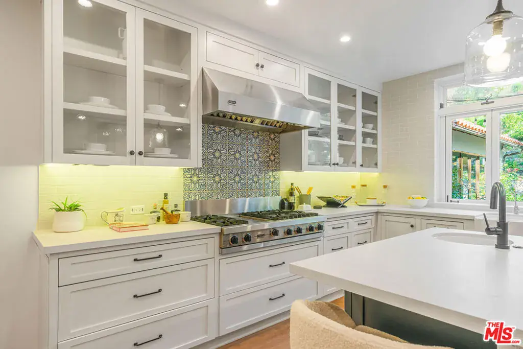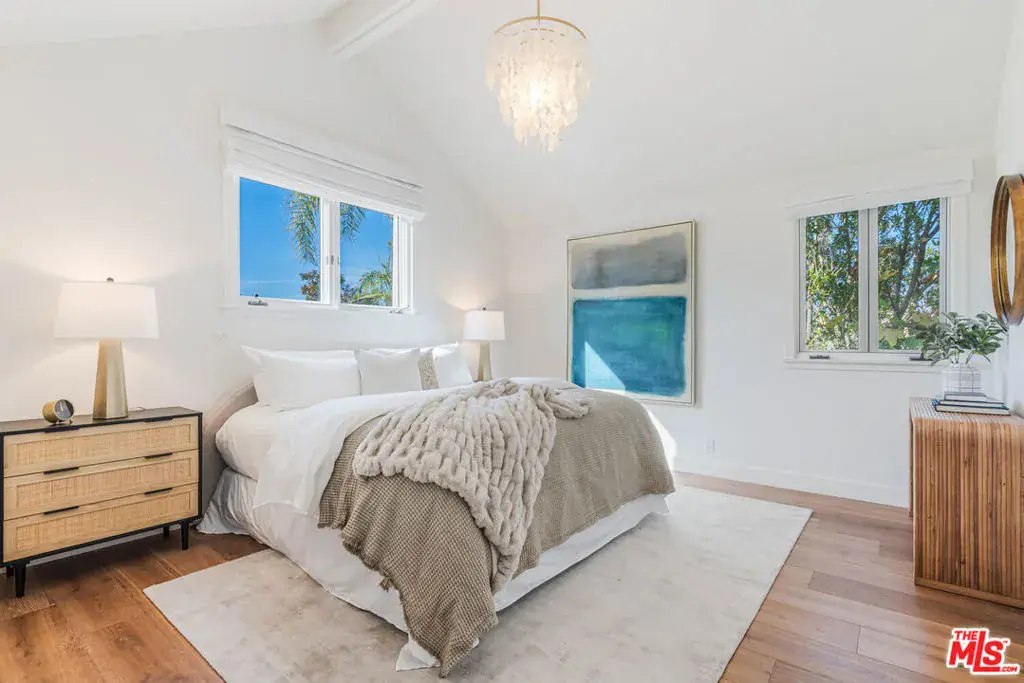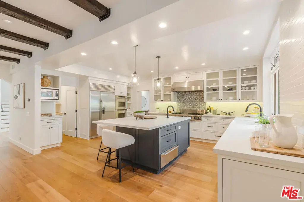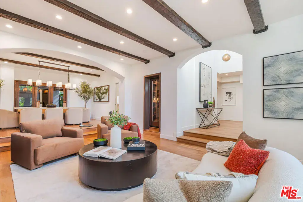Experience timeless design and modern coastal living in this beautifully renovated Spanish-style estate located in the highly desirable Palisades Hills Estates. Thoughtfully renovated and beautifully appointed, this spacious home offers exceptional craftsmanship, seamless indoor-outdoor flow, and a detached guest studio, perfect for family, guests, or a private office. The elegant, vaulted entryway opens to a grand living room and formal dining area with dramatic beamed ceilings, and beautiful, modern, wood floors throughout the home. The heart of the home is an expansive great room that seamlessly connects to a gourmet chef’s kitchen featuring top-tier stainless steel appliances, marble countertops, and a generous, walk-in butler’s pantry. A 700+ bottle, temperature-controlled, wine room is ideal for storing those perfect bottles of wine for those special occasions. Multiple rooms open to the outdoors, creating a natural connection to the lush gardens and patio spaces. Upstairs, the primary suite is a serene retreat with a vaulted sitting room, private balcony, dual walk-in closets, and a spa-inspired bath with a luxurious, free-standing tub, steam shower, and dual vanities. Two additional ensuite bedrooms upstairs offer comfort and privacy. Additionally, there is separate, designated office on the main level which could act as an additional bedroom in the main house. The backyard is an entertainer’s dream, complete with mature landscaping, fruit trees, garden paths, a built-in BBQ, Tuscan split rock pizza oven, a tranquil waterfall pond, and a romantic covered patio with fireplace. Residents of Palisades Hills Estates enjoy exclusive access to a private recreation club with pool, spa, tennis, pickleball, and basketball courts, offering a true resort-style lifestyle just minutes from the heart of Pacific Palisades.