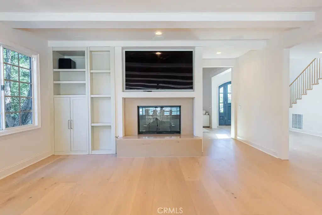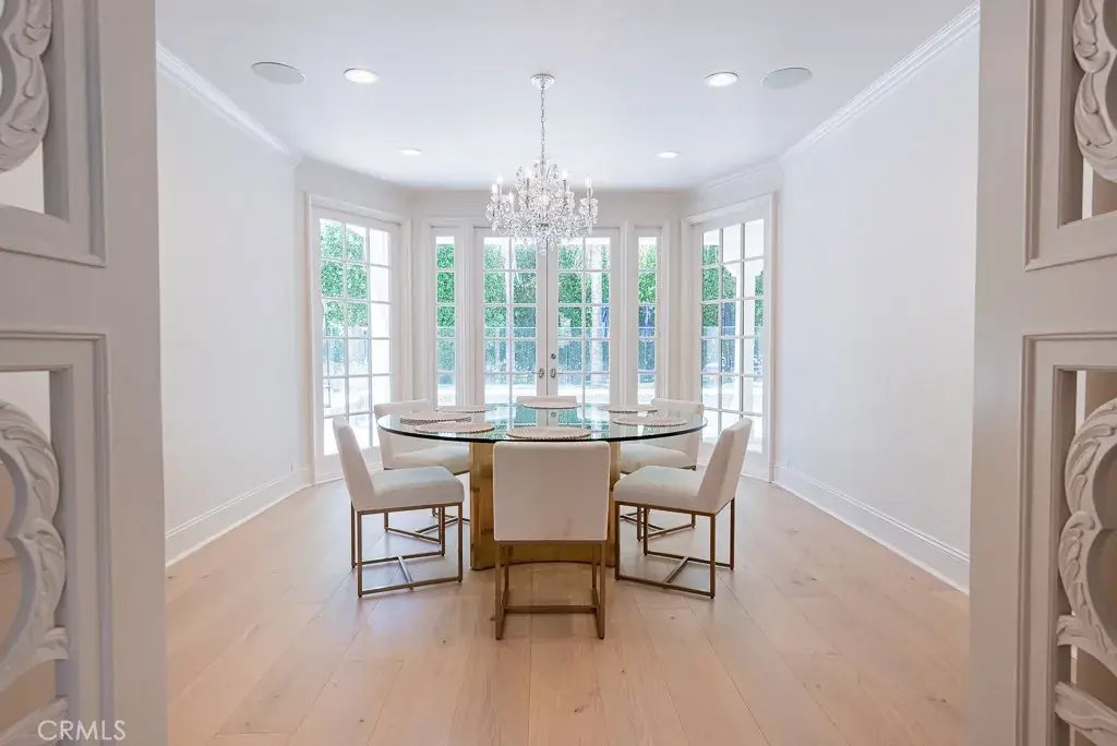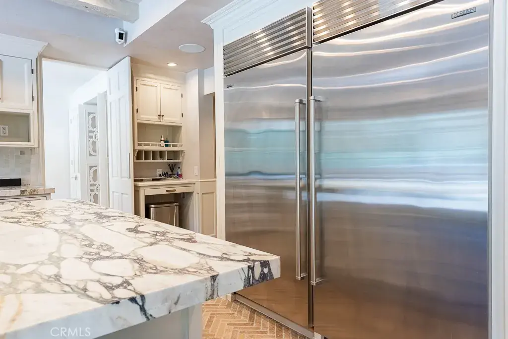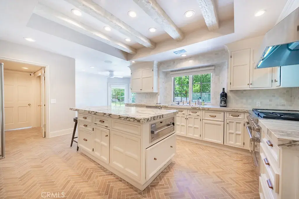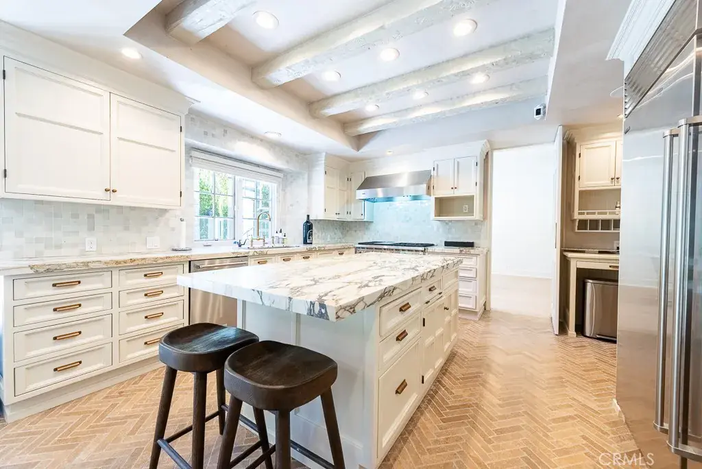 Inside, soaring beamed ceilings and expansive windows fill the home with natural light. The reimagined chef’s kitchen features Calacatta Monet marble countertops, Cle terracotta tile, SubZero and Wolf appliances, a large center island, and a sunny breakfast nook. The formal dining room and family room, complete with a double-sided fireplace and bar, offer an ideal flow for everyday living and entertaining.