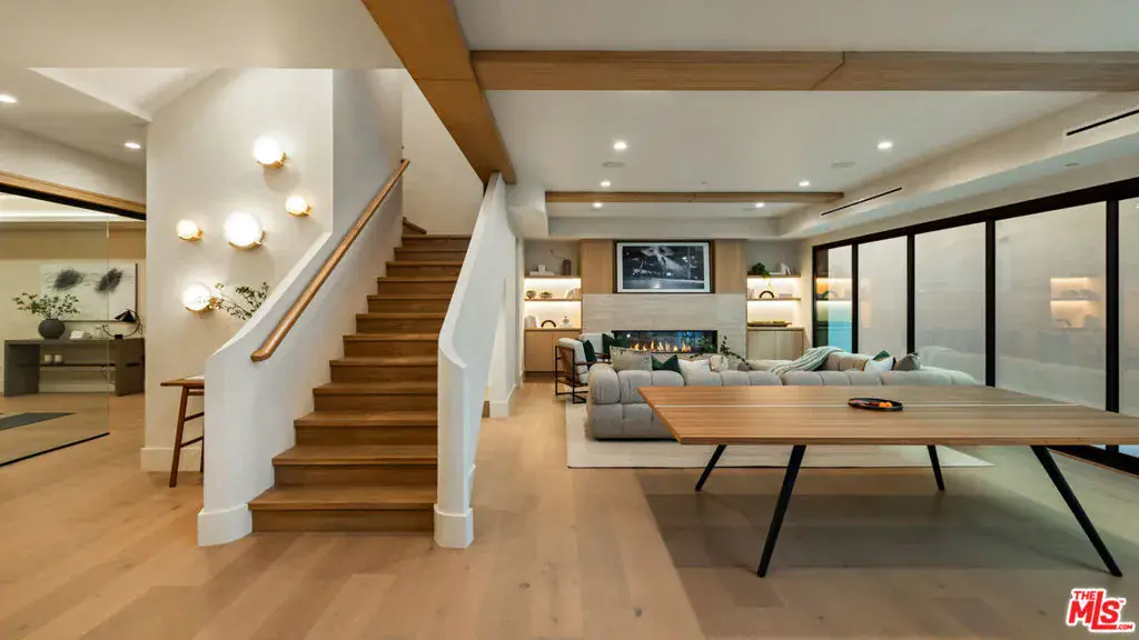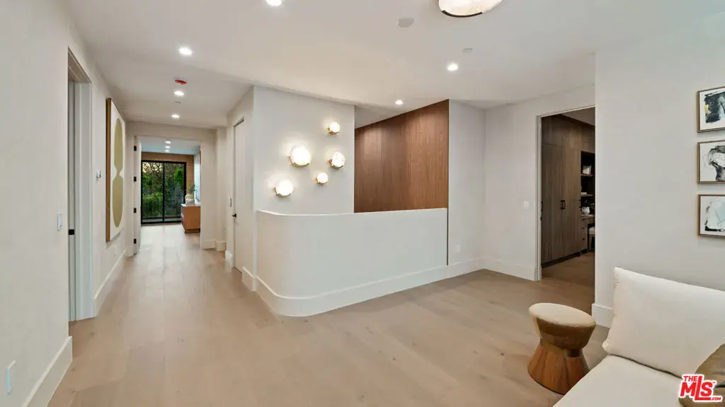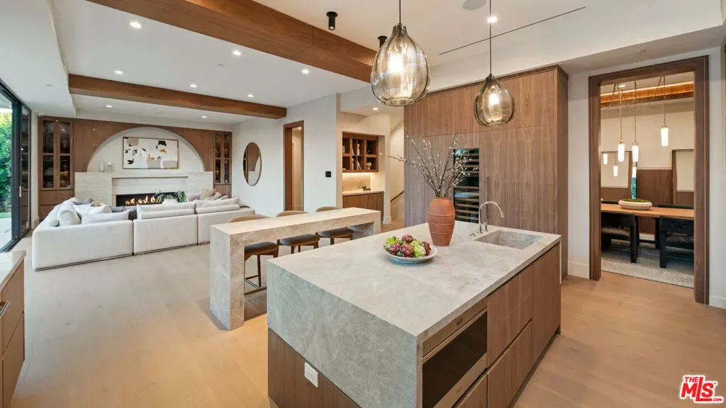 Discover refined coastal living in this newly built architectural estate in the coveted Huntington Palisades. This three-level modern masterpiece offers 7 bedrooms, 9 bathrooms, and over 8,000 sq ft of thoughtfully designed living space, blending timeless materials with cutting-edge convenience. A signature design element is the home’s intentional progression of rich walnut and warm oak: bold walnut millwork anchors the main level, while the upper and lower floors transition to softly grained oak, creating a cohesive, elevated aesthetic throughout. Limewash and Roman clay walls, soaring ceilings, and expansive openings set a warm, sophisticated tone from the moment you enter. Custom walnut and white oak cabinetry and paneling, paired with a modern mix of porcelain and glazed ceramic tile, further elevate the home’s refined material palette. The custom chef’s kitchen is the heart of the home, featuring a Sub-Zero/Wolf gourmet suite of appliances, bespoke cabinetry, an oversized island, and Taj Mahal stone slabs. An extra-large pantry with concealed secondary appliances supports seamless entertaining. The kitchen flows directly into the grand dining area and expansive family room, where a sleek travertine-clad fireplace and oversized sliding doors open to the pool, spa, and outdoor lounge for true indoor/outdoor living. The lower level is designed for entertaining and wellness, showcasing a private movie theater, an Emperador marble clad built-in bar, and a fully equipped gym with steam room. Large sliding doors extend this level to an additional outdoor area, creating a resort-like experience. Plumbing fixtures throughout include selections from Brizo, Watermark, Gessi, Toto, and Mr. Steam, blending function with luxurious craftsmanship. Upstairs, generously scaled bedroom suites provide comfort and privacy, each with curated finishes and luxurious bathrooms. The serene primary retreat offers a spa-like bath and custom wardrobe, completing the sense of everyday escape. Additional amenities include an elevator serving all three levels, a 3-car garage, and smart-home integrations. The grounds are anchored by an extraordinary 150-year-old heritage tree, a rare natural centerpiece that adds history and character to this modern residence. A rare opportunity to own a meticulously crafted new-construction home in one of Pacific Palisades’ most desirable neighborhoods, designed for both grand entertaining and effortless everyday living.