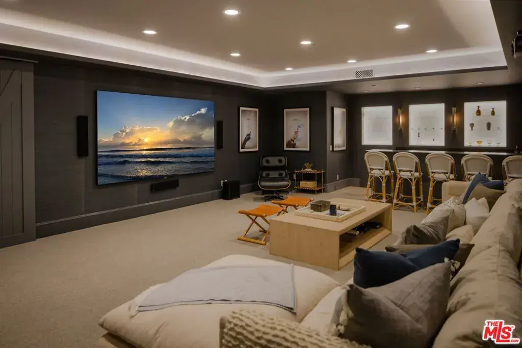 Designed by Gray Malin, renowned fine art photographer, this beautiful home exudes sophistication with a refined coastal elegance. Ideally located in Rustic Canyon, a prestigious enclave of the Pacific Palisades by the Pacific Ocean. The gated front courtyard features whimsical hedging, combining with mature trees and lush greenery for dramatic curb-appeal. Upon entry guests experience a double-height ceiling and voluminous rooms blending open-concept living with defined spaces. A formal entry, sitting room, office or den, and a refined dining room pivot around the stately oak spindle staircase. The living room with wood beamed ceiling, central fireplace and fully retractable wall of glass creates the optimal Southern California indoor-outdoor experience. The main level further includes a secondary dining area, top of the line chef’s kitchen featuring Sub-Zero and Wolf appliances with custom cabinetry and large island, dual dishwashers, a walk-in pantry, butler pantry with wine fridge, an office area, secondary entrance/mudroom and half bath. The second level is graced by an oversized primary suite with vaulted ceilings, fireplace, walk-out patio overlooking the lush backyard and canyon views, double walk-in closets, a beverage area and resort-like spa bath with heated stone flooring, soaking tub and steam shower. Three guest rooms, a flex-space perfect for a family room, children’s playroom, additional office or bedroom, three baths, and laundry complete the upper floor. At the lower level a generous family and entertainment room with state of the art movie screen, projector and surround sound, a secondary kitchenette/bar, a full home gym or bedroom and additional bathroom create the ultimate entertainment retreat. A beautiful mature oak tree defines the natural setting of the backyard with outdoor sitting areas with fire pit, a spa-pool with fountain, built-in bbq and alfresco dining area perfect for relaxation, play or entertaining guests. It offers the ultimate privacy with beautiful canyon views, a collage of greenery with citrus trees, hedges, a variety of flowers and raised garden boxes for harvesting farmed vegetables. The property features wide-plank floors and coastal designer details throughout with a 2-car garage, solar panels (with capacity to install Tesla Powerwall), EV charging, PuroServe home water filtration system and a storage room. With close proximity to nearby Rustic Canyon Park with tennis courts, top-rated Canyon & Palisades Charter Schools, and fine dining establishments Giorgio Baldi, Muse, the historic Golden Bull, Cafe Delfini, Rustic Coffee and Shore Bar. The home is matched for the most discerning clientele and can be purchased furnished, turn-key ready for occupancy. (Note: Photos 6,8,48 have been digitally altered to depict renderings of a larger pool and relocated firepit with lounge area. As per CA law, the original, unaltered image can be viewed next to the digitally altered image).