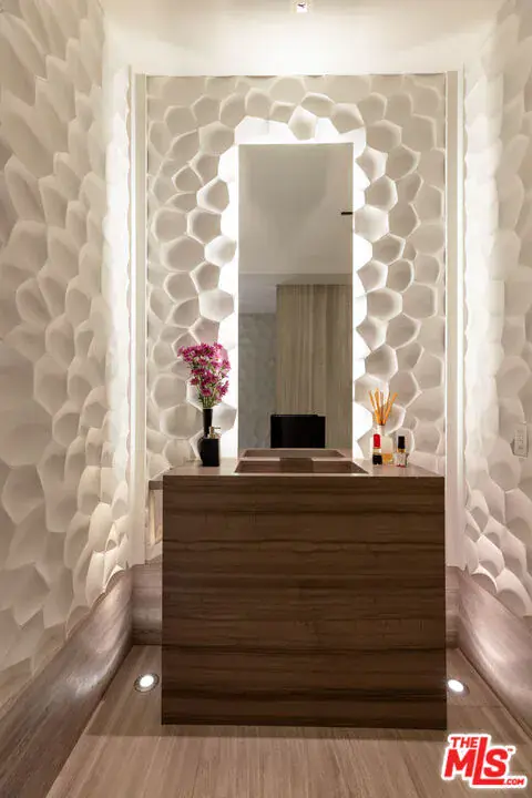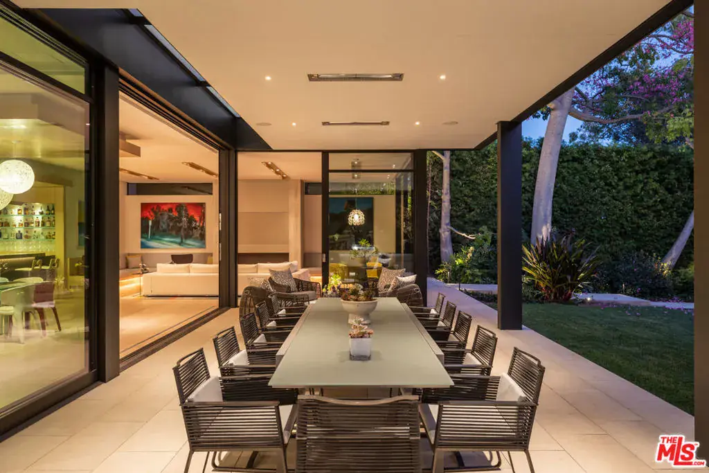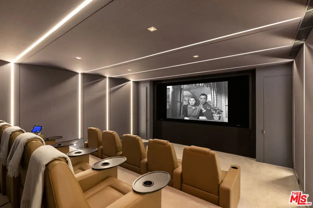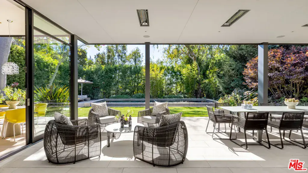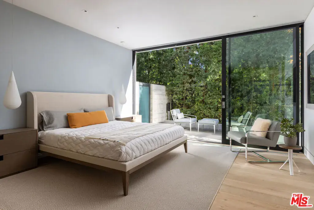 Welcome to the Flight House, a timeless Palisades Riviera architectural designed by the widely published, highly acclaimed William Hefner. A masterful fusion of high-quality materials with nods to all of earth’s basic elements, this thoughtfully crafted modern marvel arrests the senses on approach. Meticulous landscaping contributes to an overall sense of calm. Warm light glows through large metal-framed walls of glass converging with smooth concrete for added contrast behind the surrounding greenery. Inside, the foyer is itself a work of art, with an accent wall of varied vertical lines illuminating the entry as globes of glass dangle overhead. Soft floor tiles mimic the wood grain of the minimalist glass-sided staircase. A refreshingly delightful powder room welcomes visitors with a dazzling display of light reflecting off of textured walls. Beyond, the living room is centered by a commanding yet reserved fireplace flanked by plush built-in seating and clerestory windows bringing natural light in. To the left, a perfectly positioned wet bar offers plenty of room for entertaining guests. Nearby, a temperature-controlled wine enclosure separates the open-concept formal dining area from the state-of-the-art kitchen. The culinary center of the home features multiple prep spaces and built-ins including butler’s station and writing desk, a large center island with secondary prep sink and bar seating, glossy cabinetry, top-of-the-line stainless-steel appliances including Wolf cooktop with hood, quartz countertops, and built-in breakfast nook. Massive Fleetwood doors envelop the interior spaces, opening to provide seamless transition to the rear patios perfect for relaxing under the stars or dining al-fresco. Upstairs, the voluminous primary suite is the true prize of the home, with partial ocean views, a vaulted ceiling, sitting area, fireplace, and architecturally important clerestory windows bathing the space in light. The primary bathroom offers dual floating vanities, spa-inspired shower, and a dressing room to rival most department stores. Fleetwood doors access a private balcony which spans the entire rear of the home, overlooking the grounds below. Secondary bedrooms also include their own private patios for the ultimate indoor/outdoor lifestyle, and a front balcony can be found just outside the upstairs guest bedroom. Additional amenities include a three-story elevator, fully insulated safe room, theatre, gym, office, zen gardens, and studio/guest house. The rear yard is secluded by lush greenery and includes a pool with infinity waterfall edge, lounging deck, built-in barbecue, and plenty of grass to roam and play. This serene residence is currently being utilized as three bedrooms plus guest house but can be reconfigured as five bedrooms plus guest house. Welcome to this one-of-a-kind sanctuary just moments to Palisades Village, Malibu, beaches, and all of the plentiful shopping, dining, and entertainment Santa Monica and the Westside have to offer.