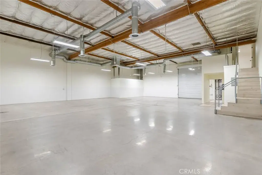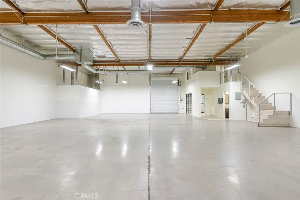 The building features a spacious open warehouse with approximately 14 foot ceiling clearance polished concrete floors exposed wood beams and extensive industrial ventilation. Bright overhead lighting and clean interior finishes create an efficient and professional working environment suitable for manufacturing distribution storage or creative industrial use.