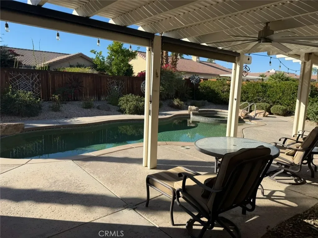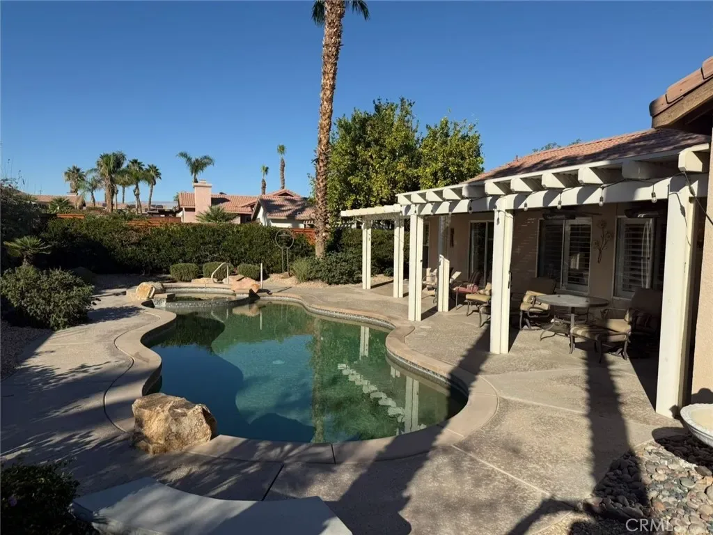 Cozy, bright, with high ceilings 3 beds 2 baths retreat house is located in one of the quiet and clean areas of sunny Palm Desert. Very well maintained and kept house has lots to offer: from wide opening double doors to an airy and spacious formal living room which opens through the sliding doors to the oasis backyard with sparkling pool and warm spa, covered sitting area, beautiful landscape with gorgeous palm trees, cactus trees and flower beds. Spacious kitchen with vaulted ceilings opens up to the dining area and cozy family room with a fireplace. Master bedroom has an ensuite bathroom with a walk-in closet and separate area for the toilet. You also have an access to the backyard through a sliding door from the MB. There are 2 specious and bright bedrooms that share a full bathroom and a separate dining room for special occasions. Separate laundry area off of the 2car neat and clean garage. Fully furnished and equipped with all the appliances, TVs and patio furniture. Ready to move-in, just bring your clothes with you and make it your home!