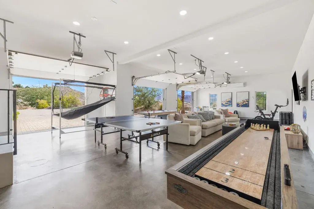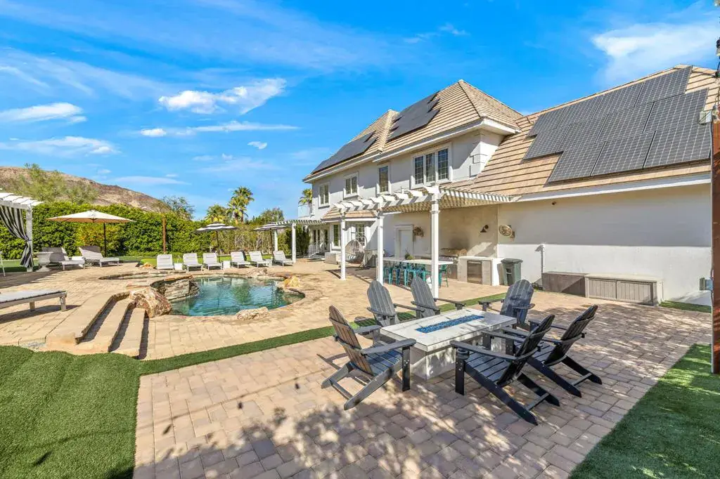 This luxurious private estate in South Palm Desert, set on a sprawling acre lot, offers the perfect blend of designer elegance and functional living with 5 bedrooms, a movie theatre, and a host of entertainment features including a private gym, gamer lounge, ping pong, air hockey, pool table, and foosball table. The chef’s kitchen boasts high-end appliances, while the home also includes two laundry rooms and multiple balconies with stunning views. An expansive solar panel system and 2 Tesla Powerwalls ensure your electric bill is low and the existing electric car charger in the garage adds convenience. The beautifully landscaped backyard is a serene oasis, featuring a natural-looking pool and spa, 7 hole putting green, hammock nest, outdoor kitchen, cabana, cozy fire pit, and multiple seating and dining areas, all framed by gorgeous mountain views and complete privacy. With a massive driveway capable of fitting up to 20 cars, this home is perfect for both everyday living and entertaining. Available for long-term lease at the advertised price, or inquire about seasonal, monthly, or daily rates for shorter stays.