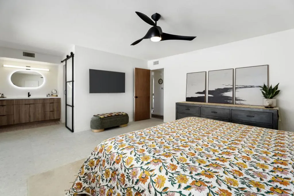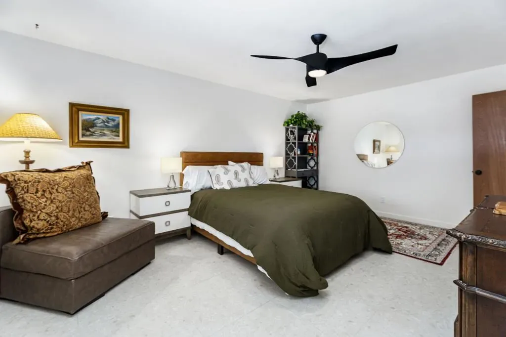 Significant Price Improvement! ~ Now Offering Exceptional Value on this fully updated Mid-Century Modern 2-bedroom, 2-bath end unit – Condo designed by renowned architect Hugh Kaptur. Offered fully furnished–just bring your toothbrush! Nestled on a peaceful cul-de-sac in South Palm Desert, this residence blends iconic architectural style with modern comfort and convenience. Step inside to a spacious open-concept living area where a striking stone fireplace serves as the focal point. Soaring vaulted ceilings and clerestory windows fill the home with natural light, complemented by elegant tile flooring and motorized shades for privacy. The updated Kitchen features sleek Quartz countertops and Stainless Steel Appliances, while the adjacent dining area provides an inviting space for everyday living or entertaining.The Primary Bedroom offers a walk-in closet, en-suite bath, and direct access to the patio with beautiful mountain views. The Guest Bedroom also features a walk-in closet, and an additional updated full bath provides comfort. The inviting private Patio creates the perfect indoor-outdoor lifestyle, Mountain Views & Ideally located near El Paseo’s world-class shopping and dining. Don’t miss this opportunity! Additional highlights include direct access to a 2-car garage with a laundry area complete with washer, dryer, and an extra refrigerator. Outdoor recreation including desert hiking and biking. Community amenities include a Pool, Spa, and Tennis Courts–offering a resort-style lifestyle in the heart of Palm Desert. Experience the perfect blend of mid-century architecture, modern updates, and desert tranquility in this exceptional home.