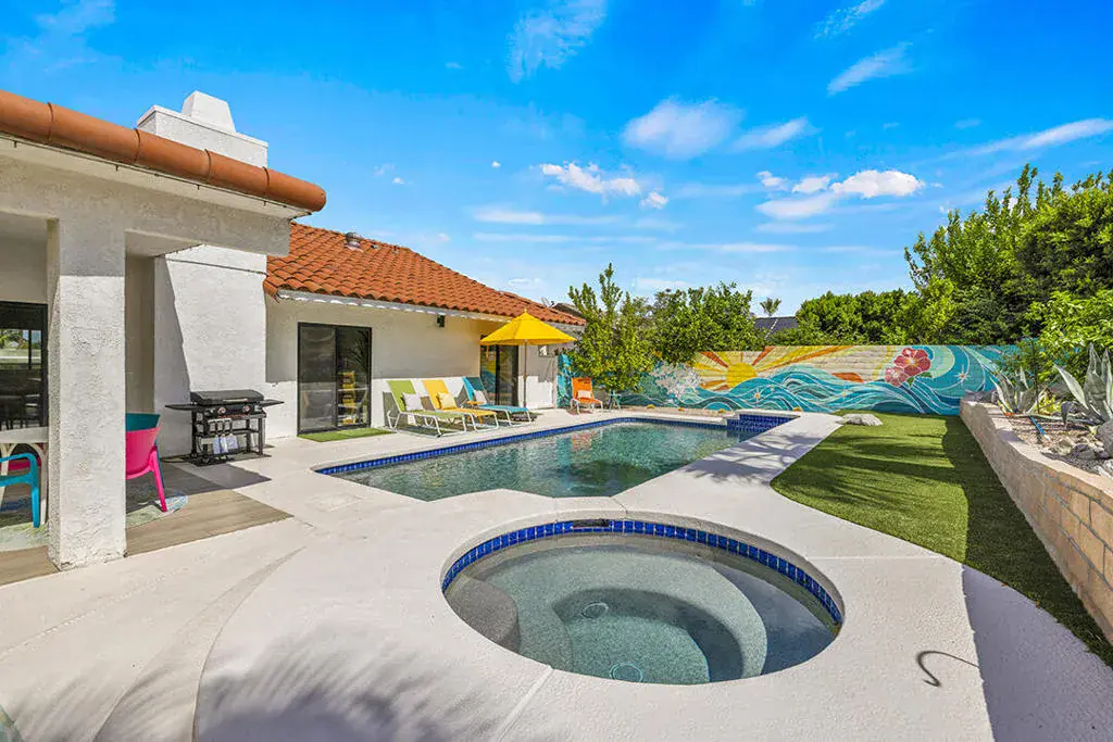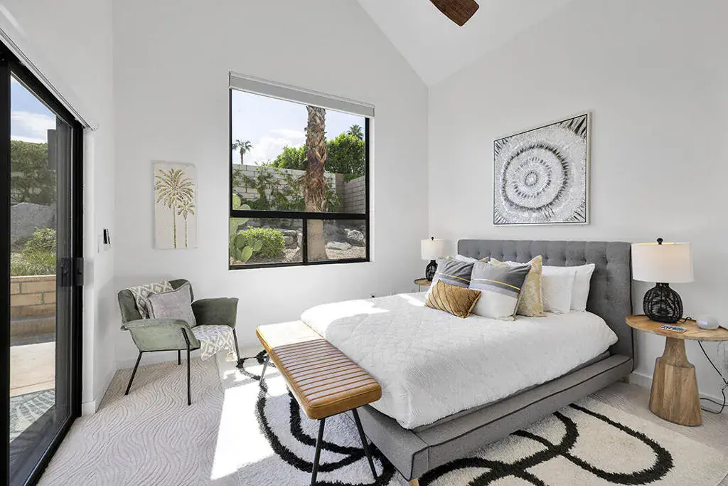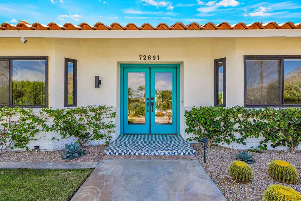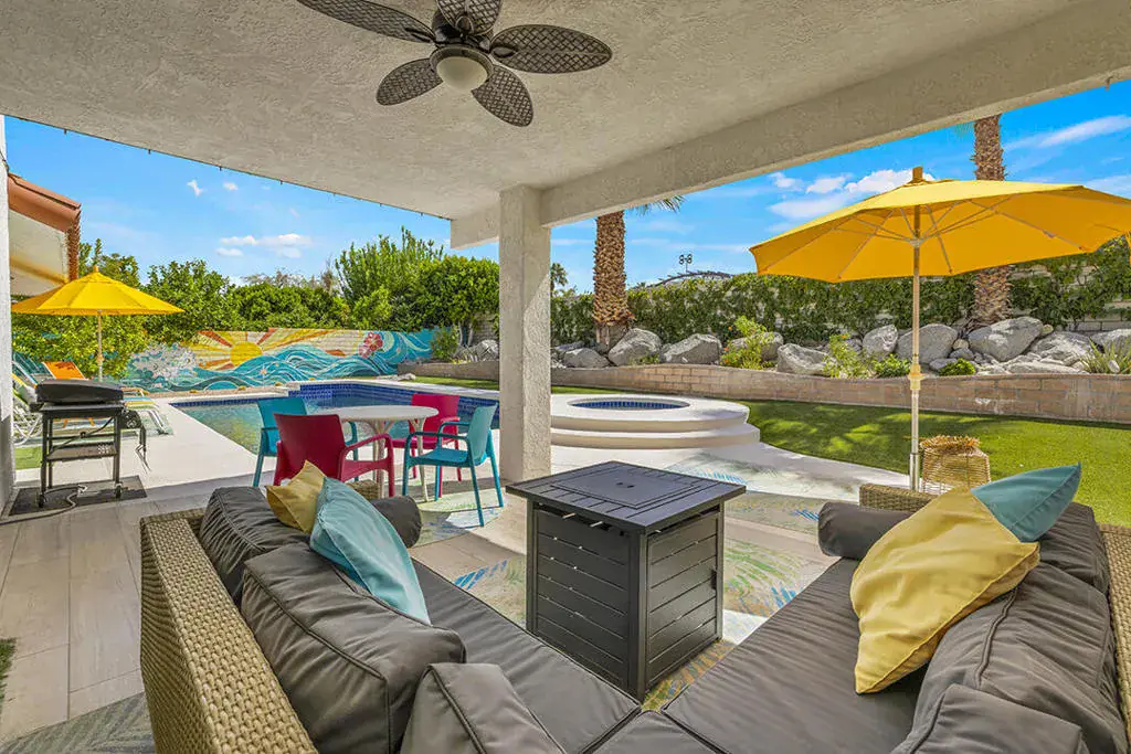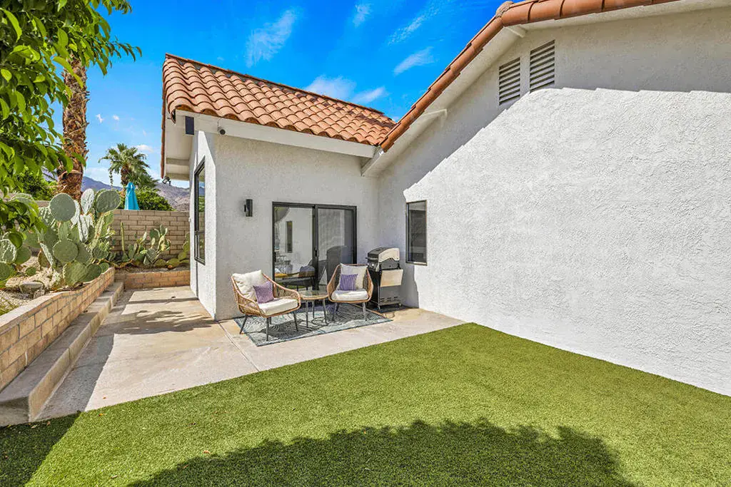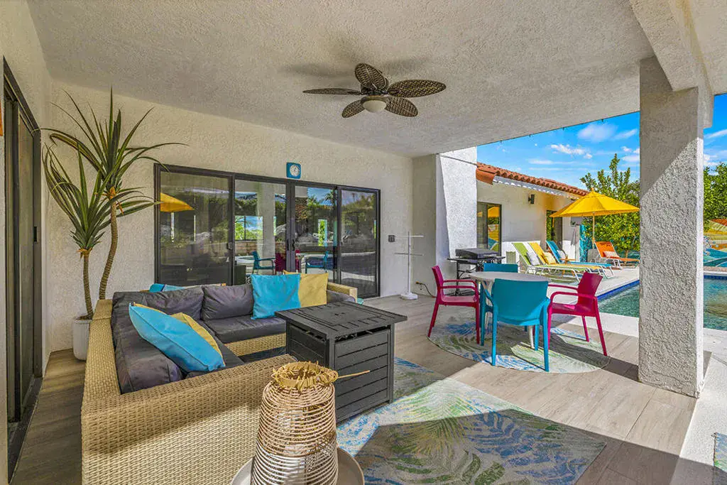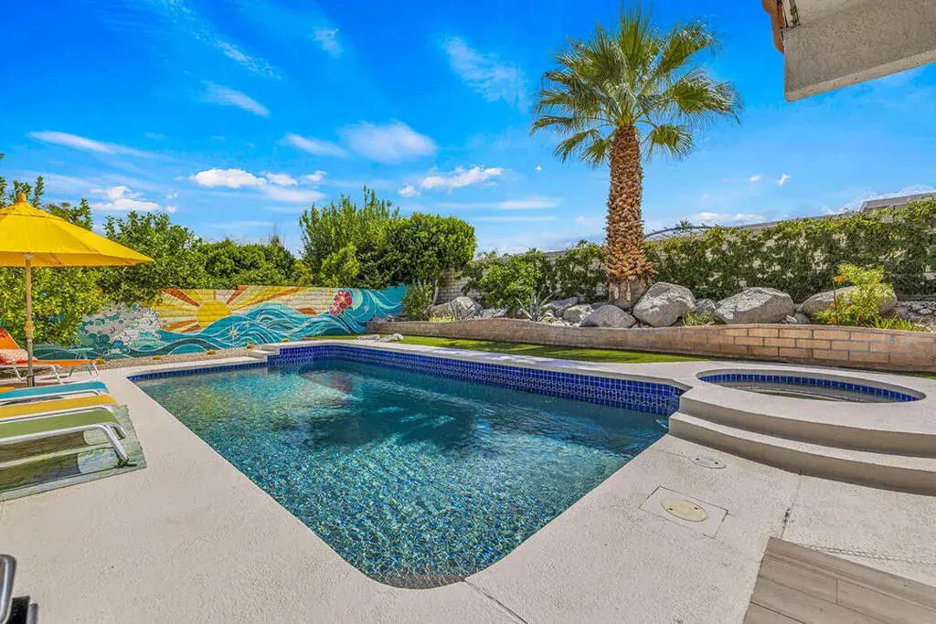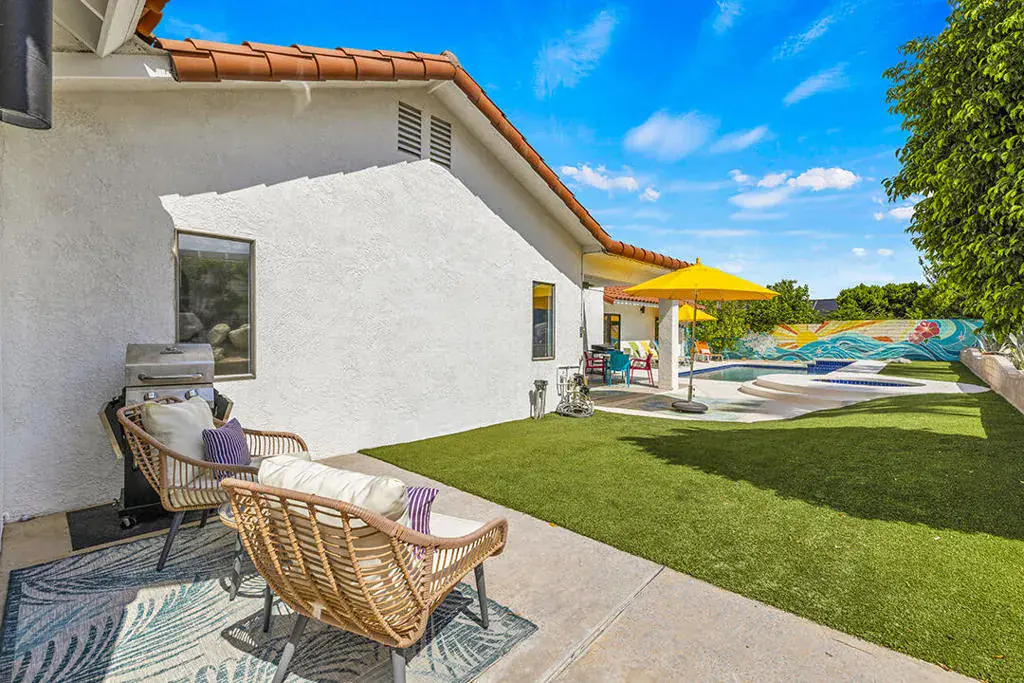 This fully furnished, professionally designed home in South Palm Desert offers modern style perfectly balanced for comfort with indoor-outdoor living. Extensively updated throughout, the open floor plan features vaulted ceilings, a spacious living room, a generous dining area, and a spectacularly renovated kitchen. Sliding doors from the living room open to a private backyard featuring lush landscaping, artificial turf, a beautiful hand-painted mural wall, and an immaculate saltwater pool with spa.Inside, entertaining is easy with the fully updated kitchen completed in 2023. Here you have quartz waterfall counters and striking tile backsplash, a dine-in prep island, and a sitting counter at the separation to the living room. Other features include a bar area, pantry, updated stainless steel appliance package, and sliding door access to the front patio.The expansive primary suite offers sliding doors to the backyard pool area and a spa-inspired bathroom with access to the large walk-in closet. Two additional bedrooms are located in the main house: one with backyard access near the full guest bath and a front bedroom with an ensuite bath. The fourth bedroom is part of a private attached guest house, complete with its own bathroom, full kitchen, and sitting and dining areas. This space has backyard access with separate patio, a dedicated washer and dryer, and dual ductless mini-split A/C systems, providing privacy for guests or the possibility for rental, or caretaker’s quarters.Just minutes from El Paseo’s premier shopping and dining, along with being sold furnished, this home is ready for you to purchase and enjoy immediately.