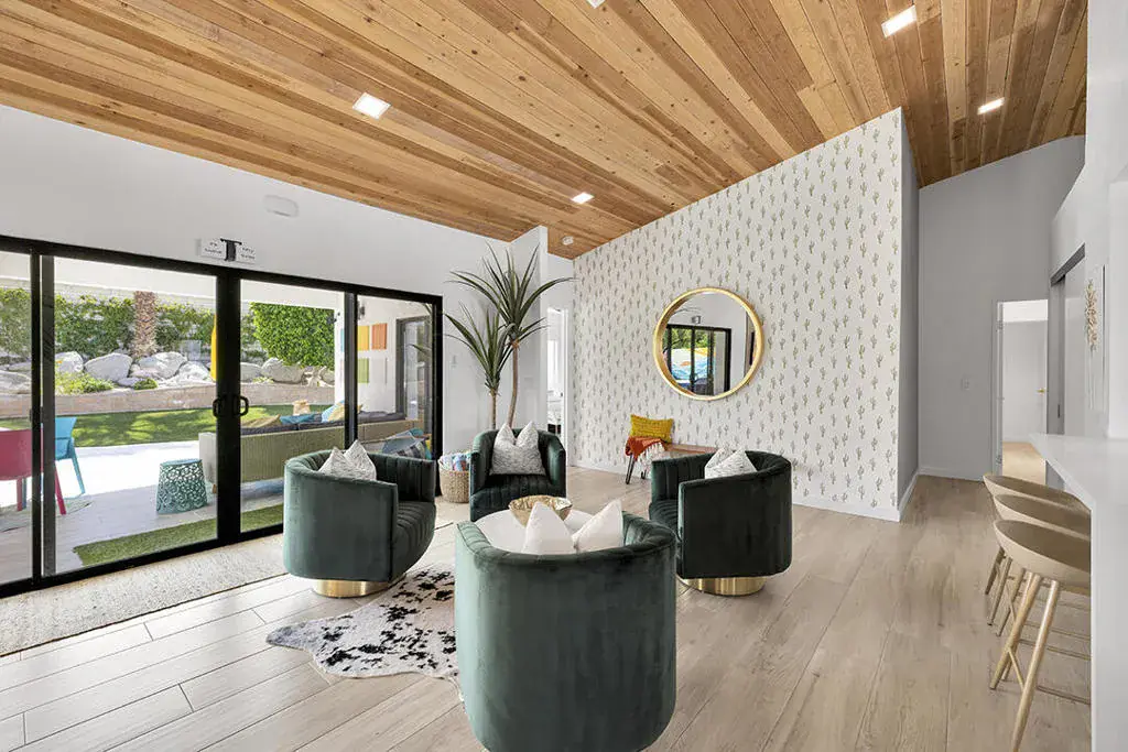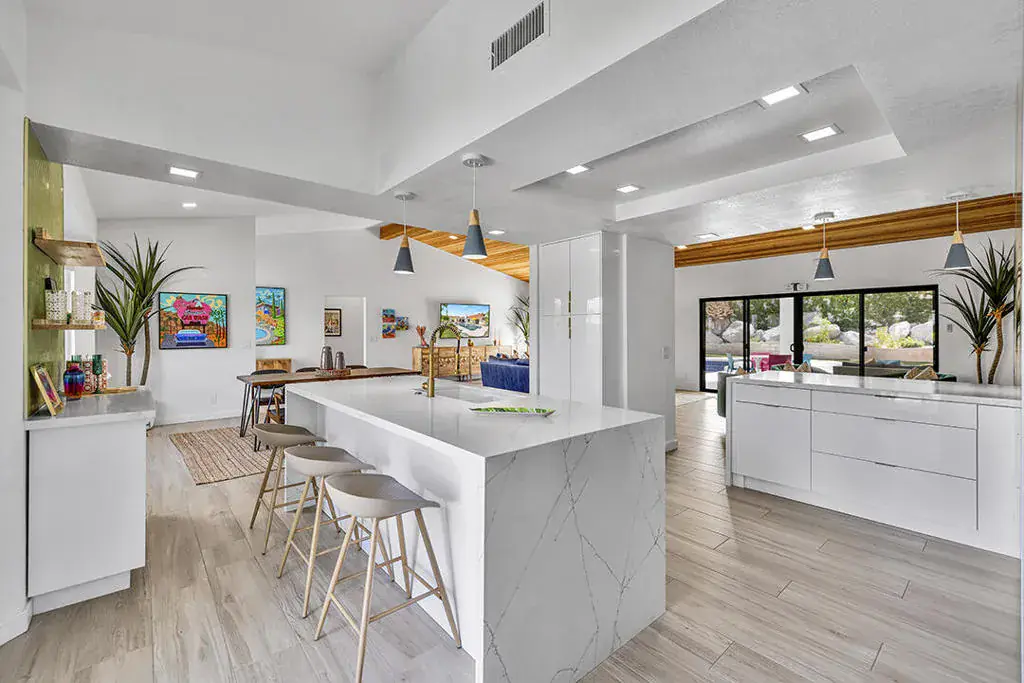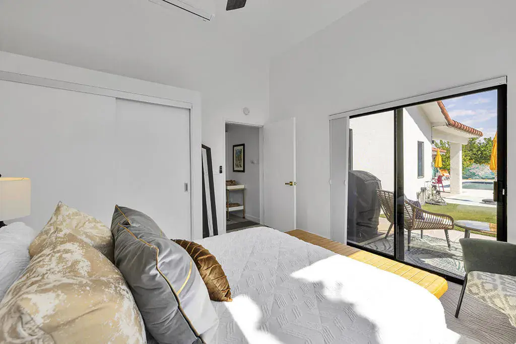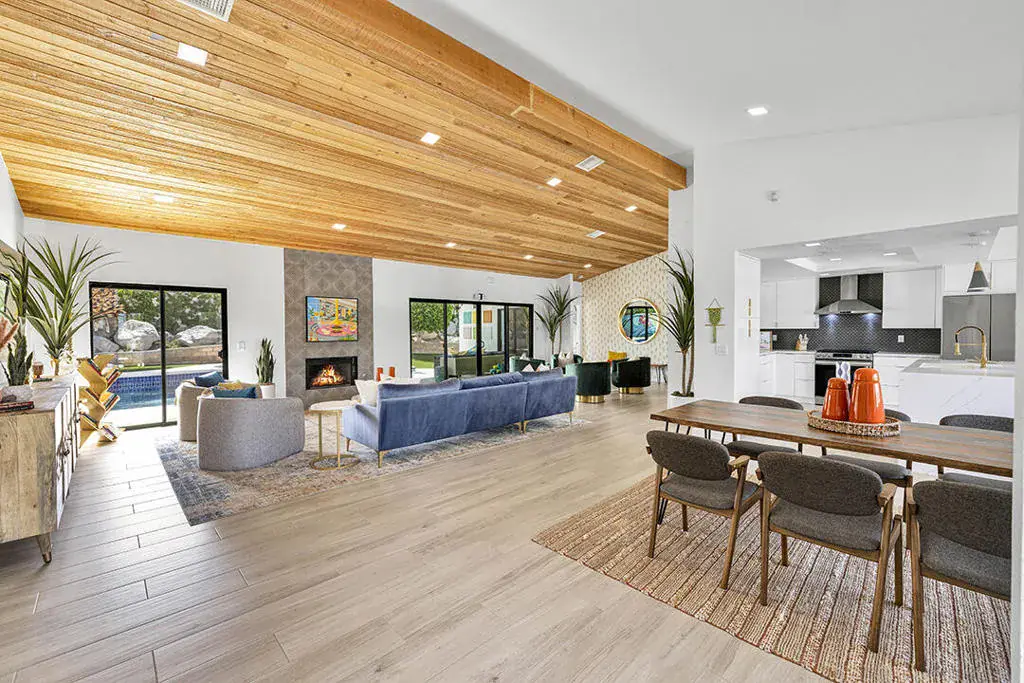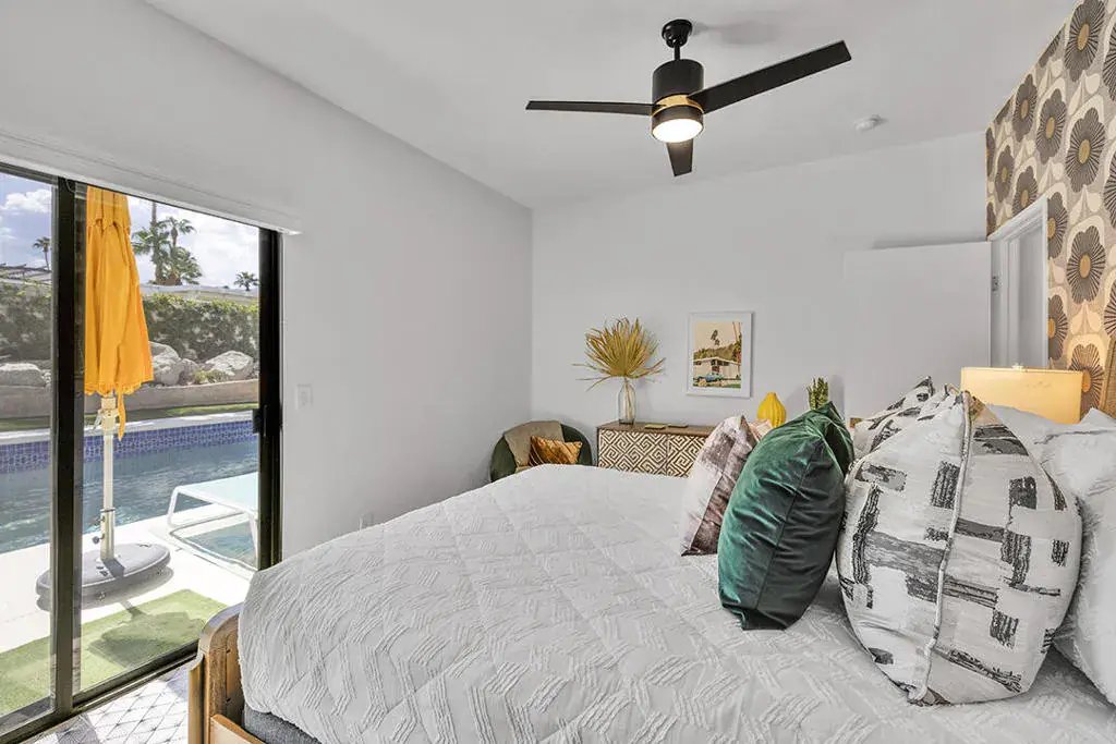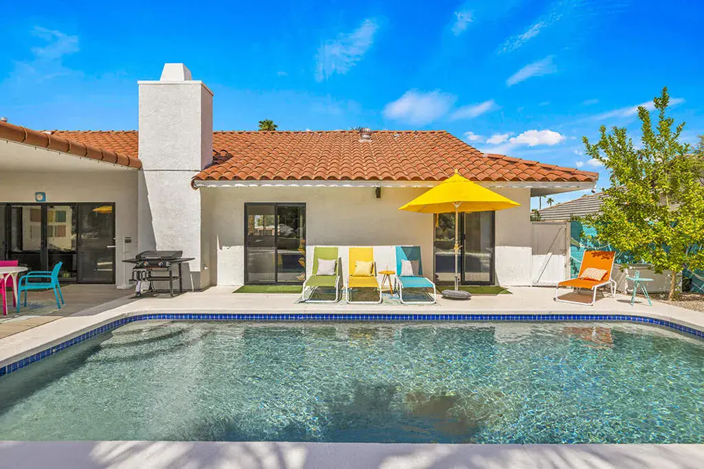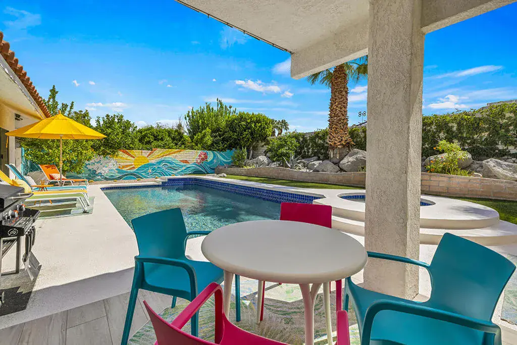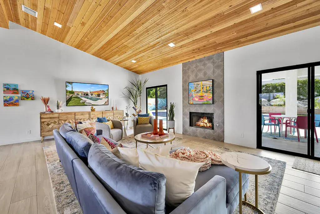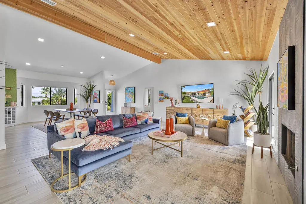This fully furnished, professionally designed home in South Palm Desert offers modern style perfectly balanced for comfort with indoor-outdoor living. Extensively updated throughout, the open floor plan features vaulted ceilings, a spacious living room, a generous dining area, and a spectacularly renovated kitchen. Sliding doors from the living room open to a private backyard featuring lush landscaping, artificial turf, a beautiful hand-painted mural wall, and an immaculate saltwater pool with spa.Inside, entertaining is easy with the fully updated kitchen completed in 2023. Here you have quartz waterfall counters and striking tile backsplash, a dine-in prep island, and a sitting counter at the separation to the living room. Other features include a bar area, pantry, updated stainless steel appliance package, and sliding door access to the front patio.The expansive primary suite offers sliding doors to the backyard pool area and a spa-inspired bathroom with access to the large walk-in closet. Two additional bedrooms are located in the main house: one with backyard access near the full guest bath and a front bedroom with an ensuite bath. The fourth bedroom is part of a private attached guest house, complete with its own bathroom, full kitchen, and sitting and dining areas. This space has backyard access with separate patio, a dedicated washer and dryer, and dual ductless mini-split A/C systems, providing privacy for guests or the possibility for rental, or caretaker’s quarters.Just minutes from El Paseo’s premier shopping and dining, along with being sold furnished, this home is ready for you to purchase and enjoy immediately.