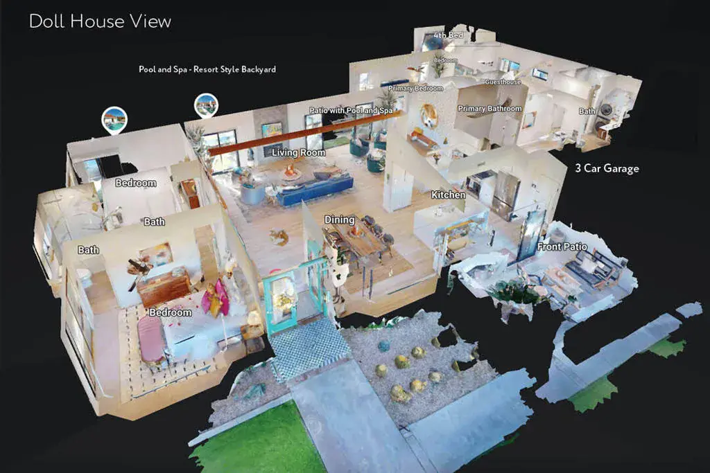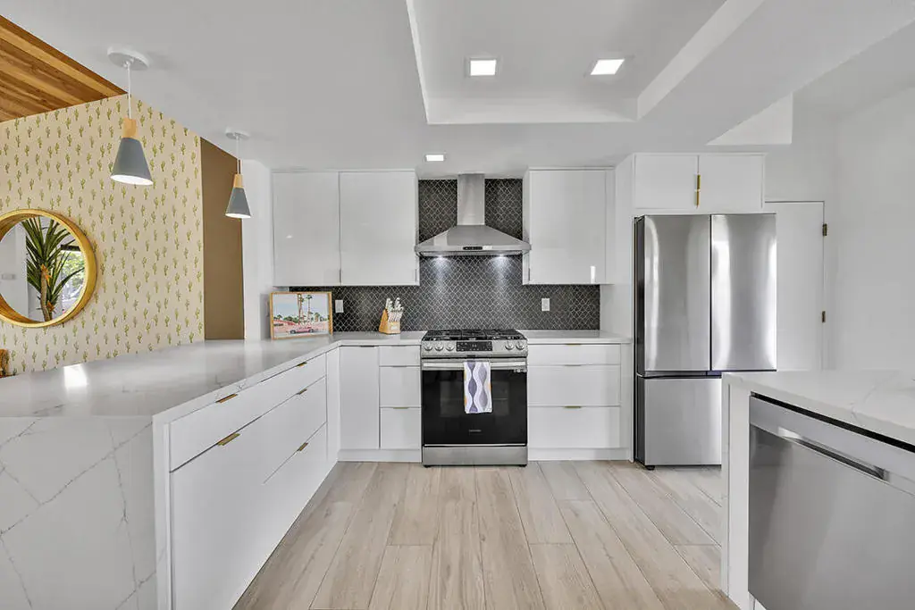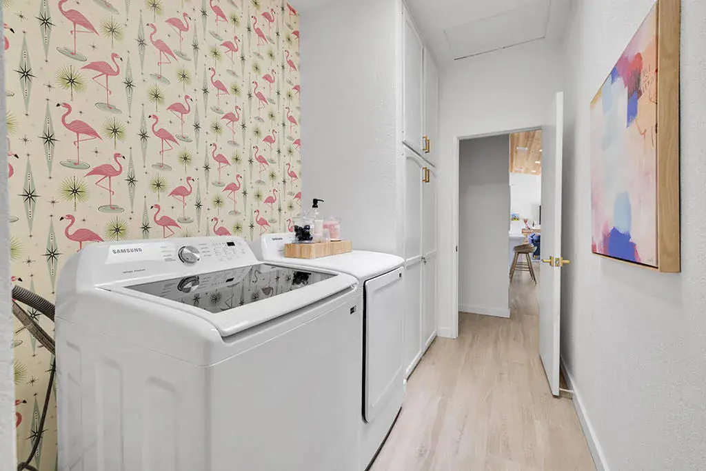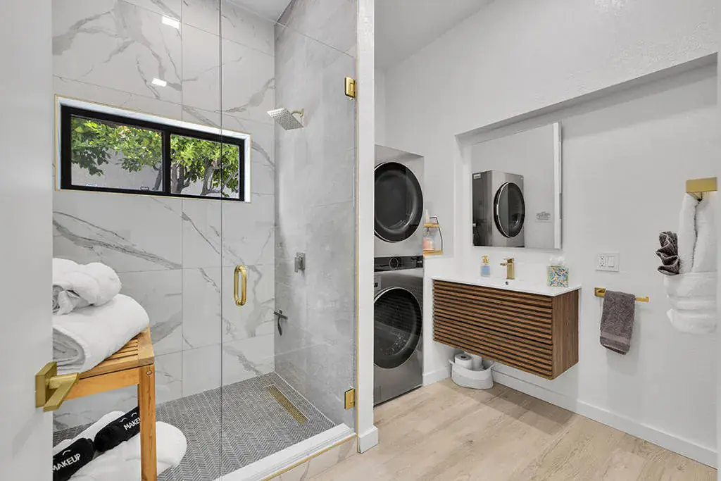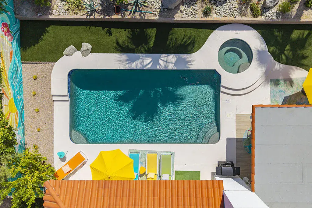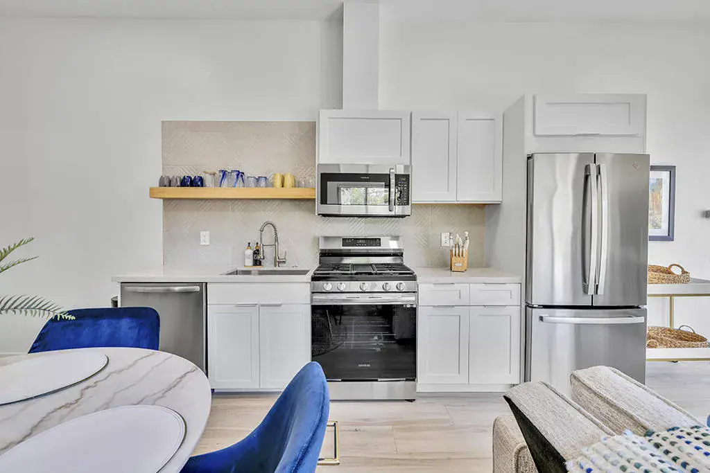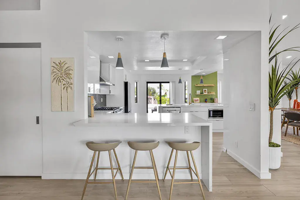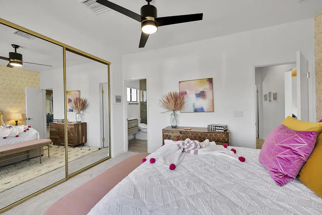 This fully furnished, professionally designed home in South Palm Desert offers modern style perfectly balanced for comfort with indoor-outdoor living. Extensively updated throughout, the open floor plan features vaulted ceilings, a spacious living room, a generous dining area, and a spectacularly renovated kitchen. Sliding doors from the living room open to a private backyard featuring lush landscaping, artificial turf, a beautiful hand-painted mural wall, and an immaculate saltwater pool with spa.Inside, entertaining is easy with the fully updated kitchen completed in 2023. Here you have quartz waterfall counters and striking tile backsplash, a dine-in prep island, and a sitting counter at the separation to the living room. Other features include a bar area, pantry, updated stainless steel appliance package, and sliding door access to the front patio.The expansive primary suite offers sliding doors to the backyard pool area and a spa-inspired bathroom with access to the large walk-in closet. Two additional bedrooms are located in the main house: one with backyard access near the full guest bath and a front bedroom with an ensuite bath. The fourth bedroom is part of a private attached guest house, complete with its own bathroom, full kitchen, and sitting and dining areas. This space has backyard access with separate patio, a dedicated washer and dryer, and dual ductless mini-split A/C systems, providing privacy for guests or the possibility for rental, or caretaker’s quarters.Just minutes from El Paseo’s premier shopping and dining, along with being sold furnished, this home is ready for you to purchase and enjoy immediately.