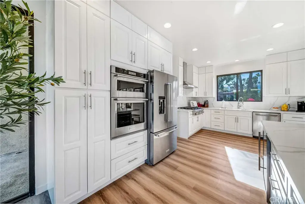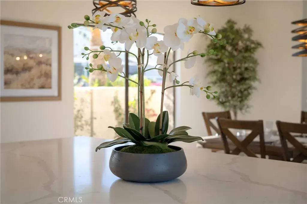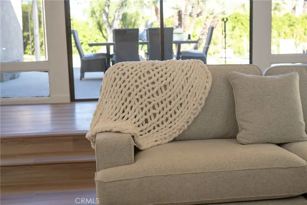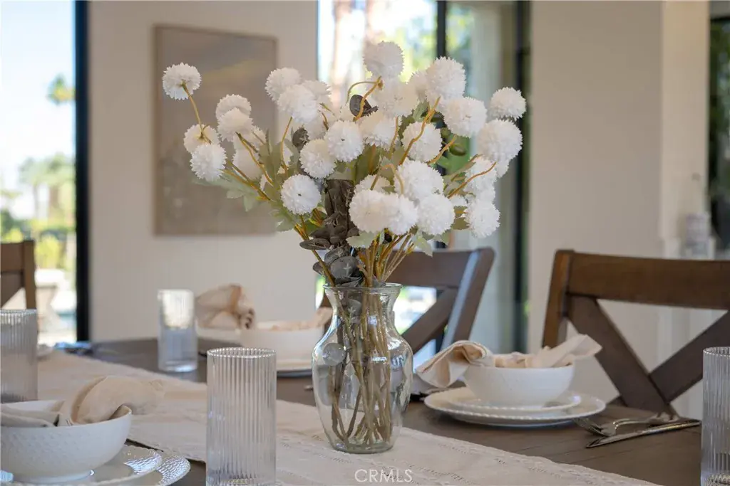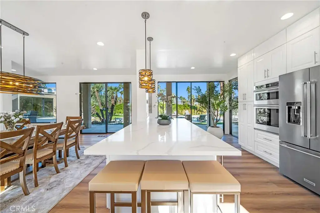 The living room is a true showstopper, boasting large windows that frame breathtaking views of the pool and surrounding desert landscape. A cozy fireplace invites you to relax and unwind on cool evenings, while plush seating arrangements provide ample space for socializing. The modern kitchen is a chef’s dream, equipped with high-end stainless steel appliances, sleek granite countertops, and a spacious island with seating for casual dining.