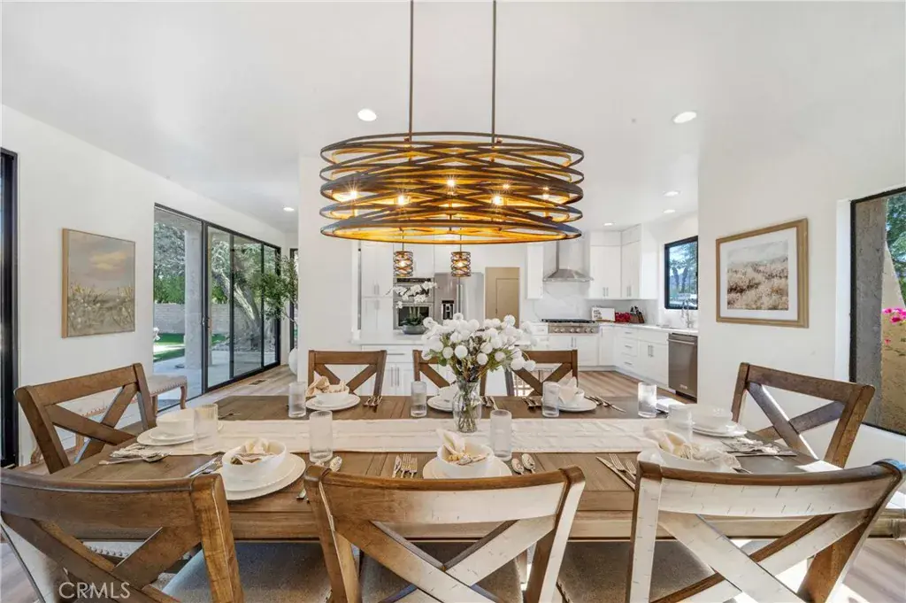Adjacent to the kitchen, you’ll find a formal dining area with a large rustic wooden table, perfect for hosting gatherings and enjoying memorable meals with family and friends. The property features three bedrooms, each with comfortable king size beds and stylish decor. The master suite, with its own private access to the pool area, offers a luxurious retreat with an en-suite bathroom featuring dual vanities and a walk-in shower.