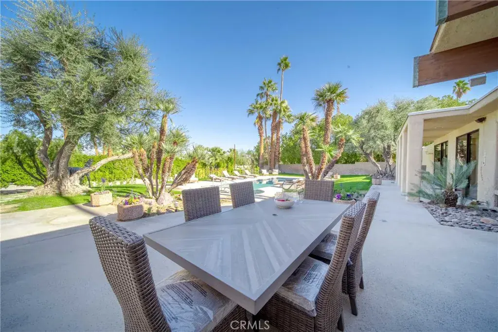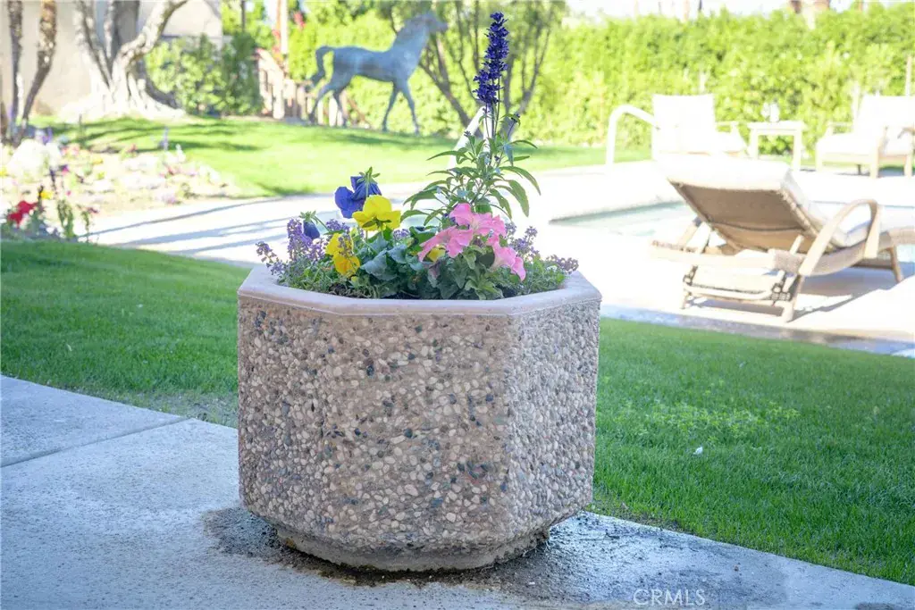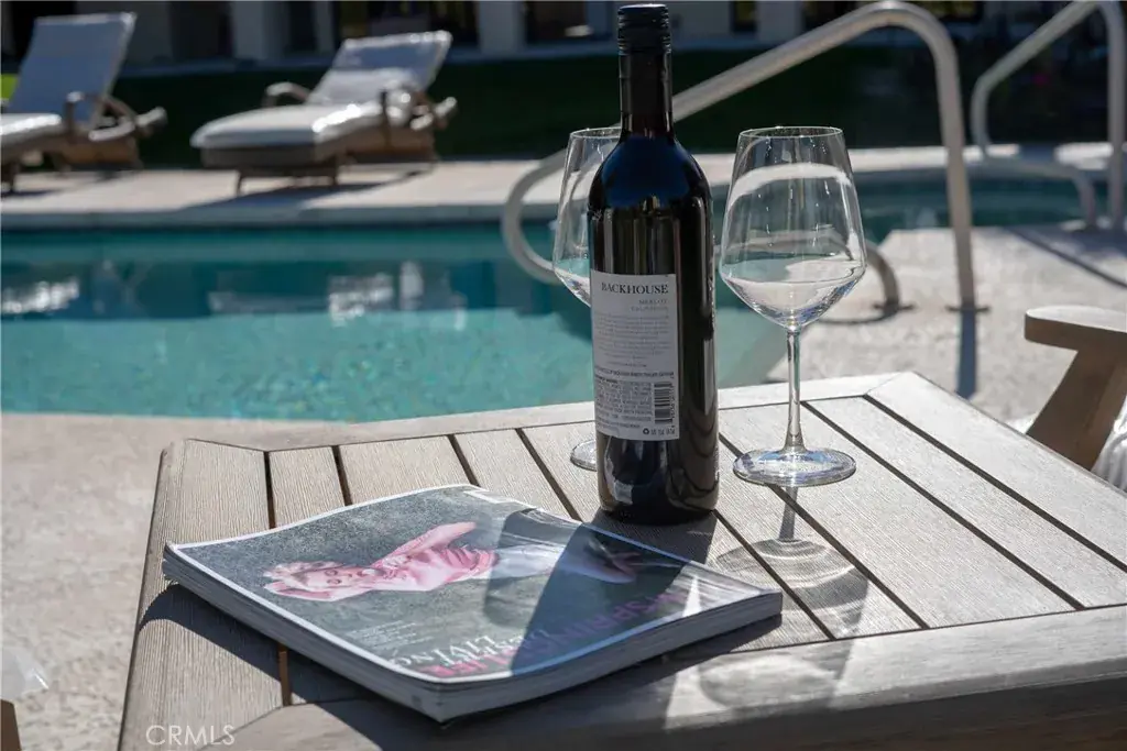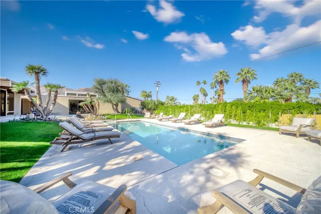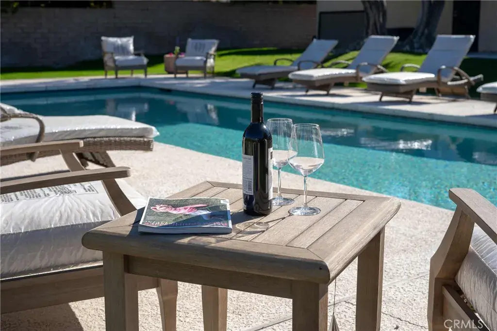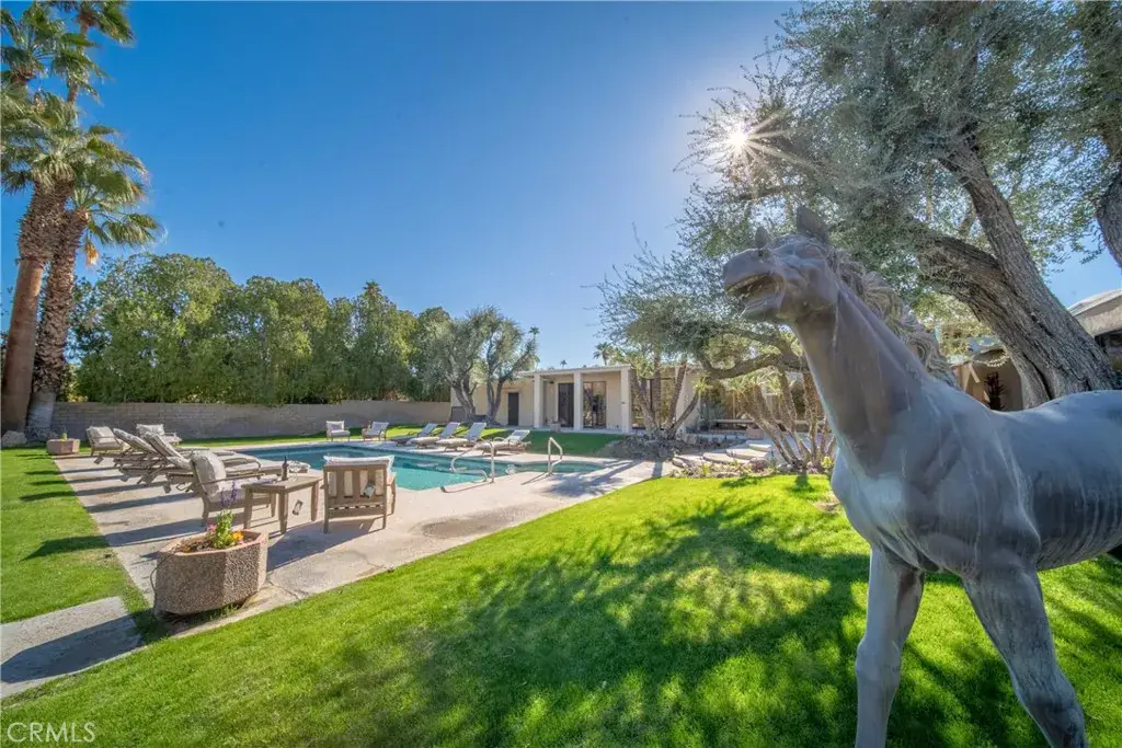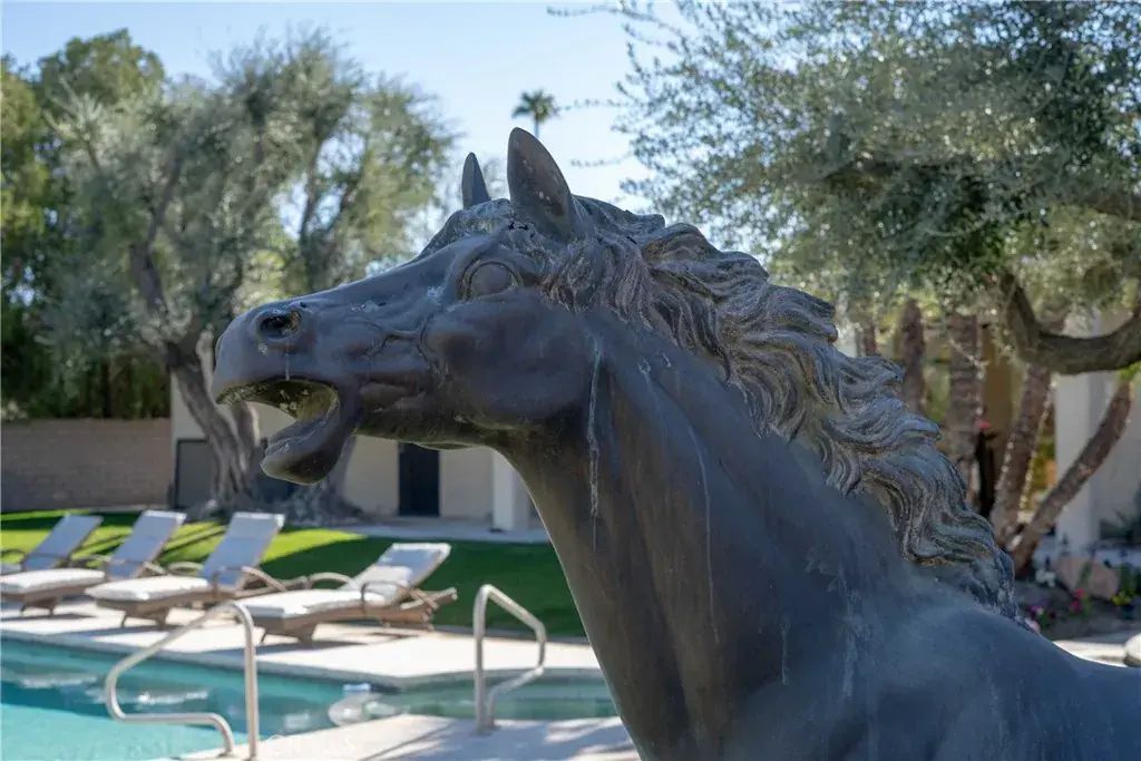 The heart of Casa Ironwood is undoubtedly the outdoor oasis. The sparkling pool and soothing spa beckon you to relax and unwind under the California sun. Lounge chairs provide ample space for sunbathing, while the surrounding landscaping creates a private and tranquil retreat. A unique bronze horse sculpture adds a touch of artistic flair to the outdoor space.