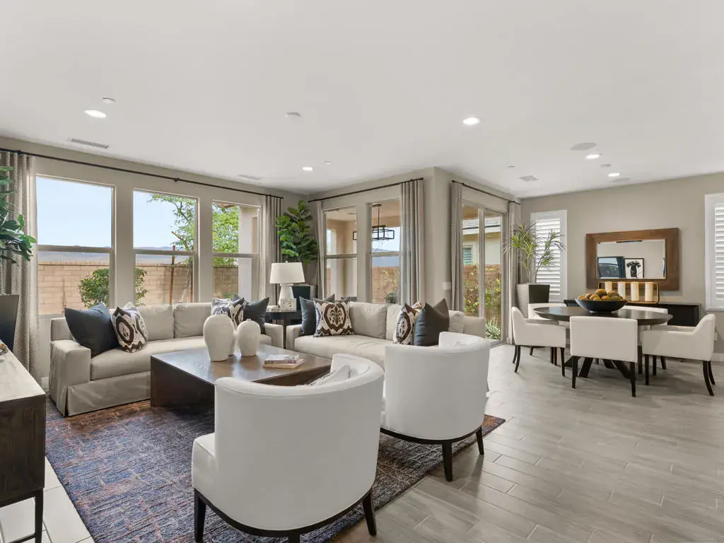 A rare opportunity to own a never-lived-in Ponderosa model home with gorgeous mountain views and immediate occupancy. Built by Ponderosa Home Builders, a developer known for superior craftsmanship, build quality, and enduring finishes, this thoughtfully designed and impeccably finished single-level, two-bedroom home with a spacious den showcases the quality and attention to detail for which the builder is known.The open-concept living area connects seamlessly to the kitchen, creating an inviting space ideal for both everyday living and entertaining. The kitchen features quartz waterfall countertops, stainless steel appliances, under-cabinet lighting, a walk-in pantry, and upgraded tile flooring and carpet, with finishes selected for timeless appeal and durability rather than trend-driven design.Eight-foot doors throughout, a tankless water heater, and a 5kW owned solar system reflect a strong focus on efficiency, comfort, and build quality. Large windows frame the surrounding mountain backdrop, enhancing the home’s light, open feel. As a professionally curated model home, the residence showcases premium upgrades and designer furnishings available for separate purchase, offering buyers a convenient and customizable turnkey opportunity without construction delays or upgrade wait times.Residents enjoy access to a newly completed clubhouse featuring a resort-style pool and spa, modern fitness center, yoga lawn, and BBQ area. Conveniently located near shopping, dining, entertainment, and medical centers, with Palm Springs approximately twenty minutes away.An exceptional opportunity to own a pristine, move-in-ready model home with elevated finishes, owned solar, striking mountain views, and well-appointed community amenities, delivering a level of quality and readiness that sets it apart.