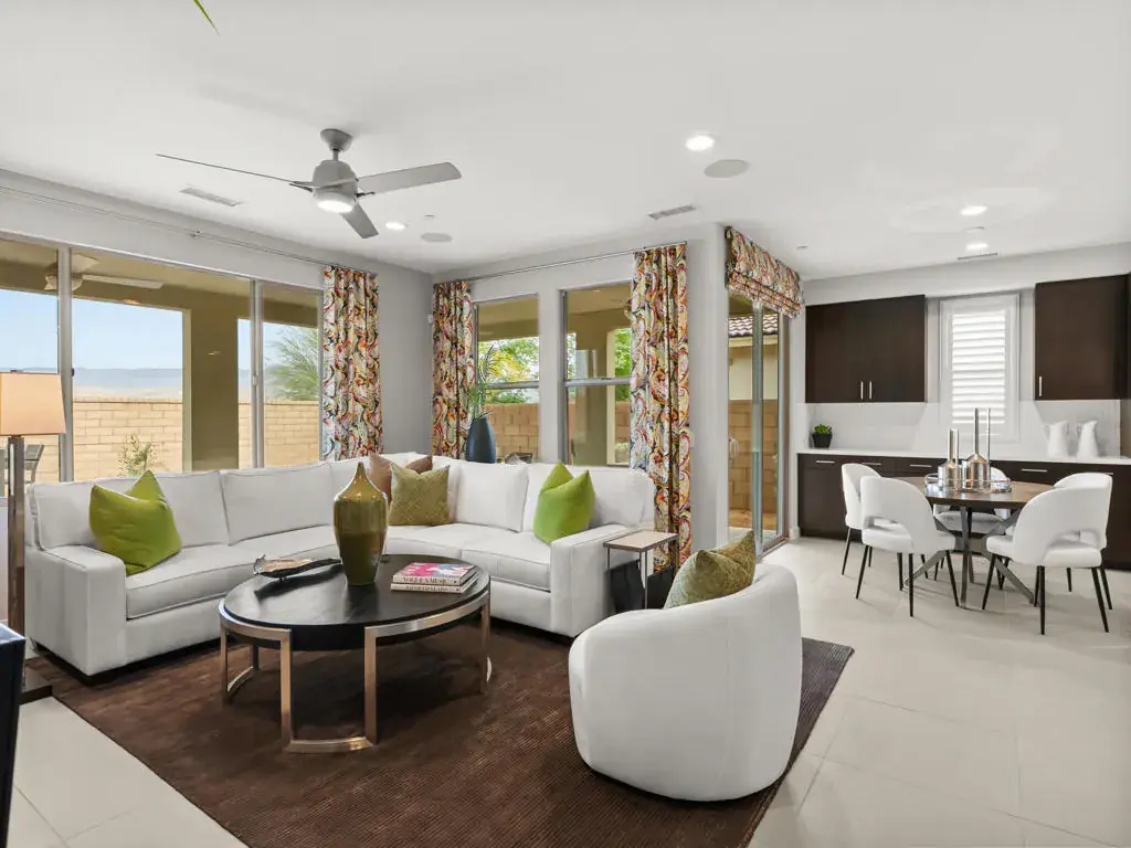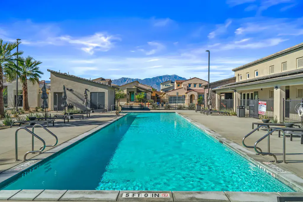 A rare opportunity to own a never-lived-in, two-story Ponderosa model home with stunning mountain views, a 5kW owned solar system, and ready for immediate occupancy. Built by Ponderosa Home Builders, a developer known for superior craftsmanship, build quality, and enduring finishes, this thoughtfully designed and impeccably finished residence features three bedrooms, a spacious den, and a versatile loft, offering exceptional flexibility.The open-concept main living area flows seamlessly into the kitchen, creating an inviting space ideal for both everyday living and entertaining. The gourmet kitchen is equipped with stainless steel appliances, under-cabinet lighting, and a generous walk-in pantry. Upgraded tile flooring and carpet are featured throughout the home, with high-end finishes selected for timeless appeal and long-term durability rather than trend-driven design.Eight-foot doors throughout enhance the home’s open, upscale feel, while a tankless water heater and owned solar system reflect a strong emphasis on efficiency, comfort, and build quality. Large windows enhance the home’s light-filled interior while framing the stunning mountain view backdrop.As a professionally curated model home, the residence showcases premium upgrades and designer furnishings available for separate purchase, providing a convenient and customizable turnkey opportunity.Residents enjoy access to a newly completed clubhouse featuring a resort-style pool and spa, modern fitness center, yoga lawn, and BBQ area. Conveniently located near shopping, dining, and entertainment, with Palm Springs approximately twenty minutes away.An exceptional opportunity to own a pristine, move-in-ready model home with a flexible two-story layout, elevated finishes, owned solar, striking mountain views, and access to well-appointed community amenities, delivering a level of quality and readiness that sets it apart!