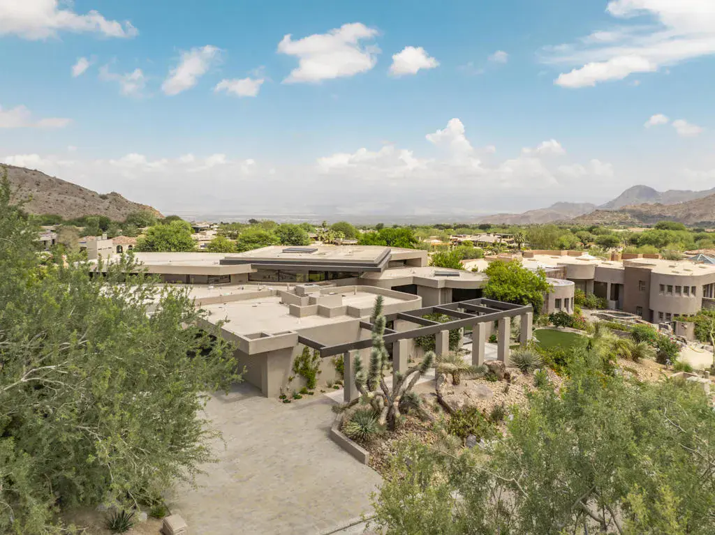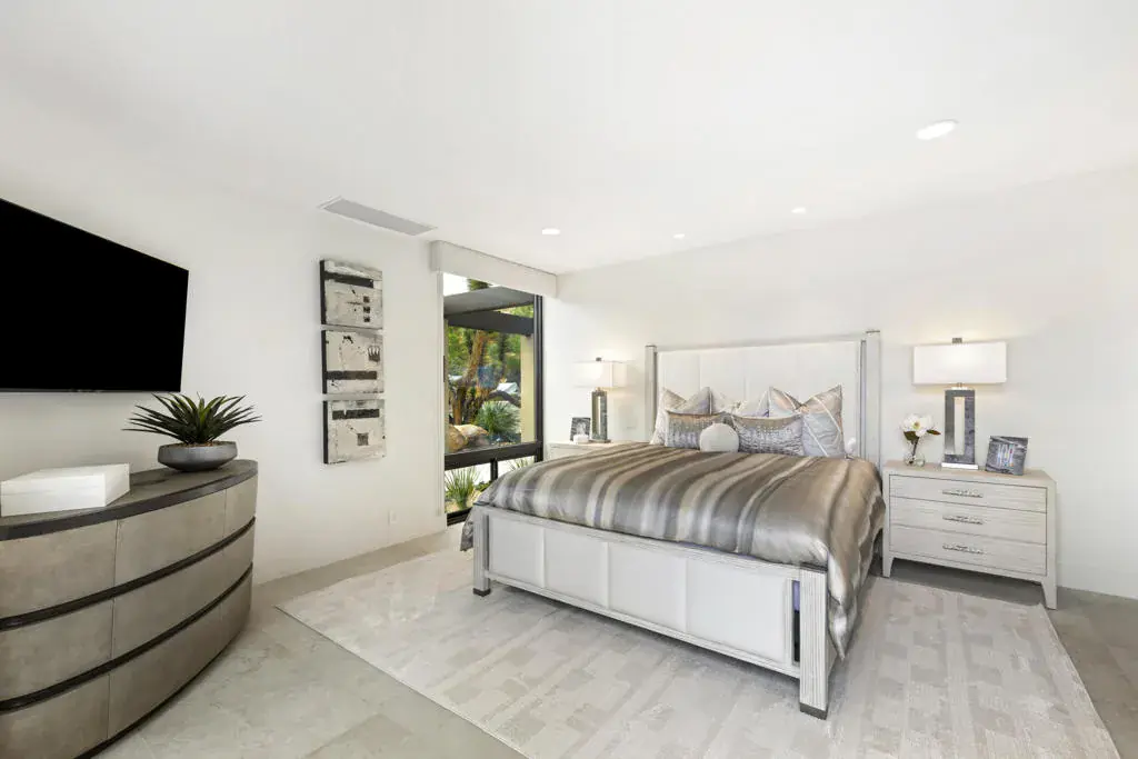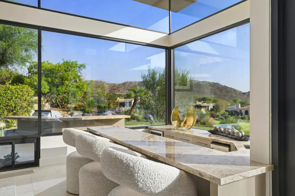 An iconic Guy Dreier design completely transformed by Easton Builders with interiors by Fedderly & Associates. Located in the prestigious Bighorn Golf Club, one of the desert’s most exclusive private clubs, this 5,400 sq ft home offers 4 bedrooms, 6 bathrooms, and commanding views of the 9th fairway, picturesque mountain ranges, and city lights from Bighorn’s Mountains Course. The primary suite features a private office with courtyard views, luxurious master bath, and newly remodeled steam bath capturing breathtaking vistas. Two interior guest suites occupy the opposite wing, plus a separate-entrance guest house for ultimate privacy. Soaring ceilings, floor-to-ceiling glass, and seamless indoor-outdoor flow create stunning living spaces throughout. Multiple outdoor entertaining areas include a pool and spa, built-in BBQ, reimagined river water feature, and firepit perfect for sunset gatherings. Essentially a brand-new home with stunning cosmetic upgrades, it also features a new roof, completely new plumbing, electrical, HVAC systems, pool equipment. Offered fully furnished and move-in ready.